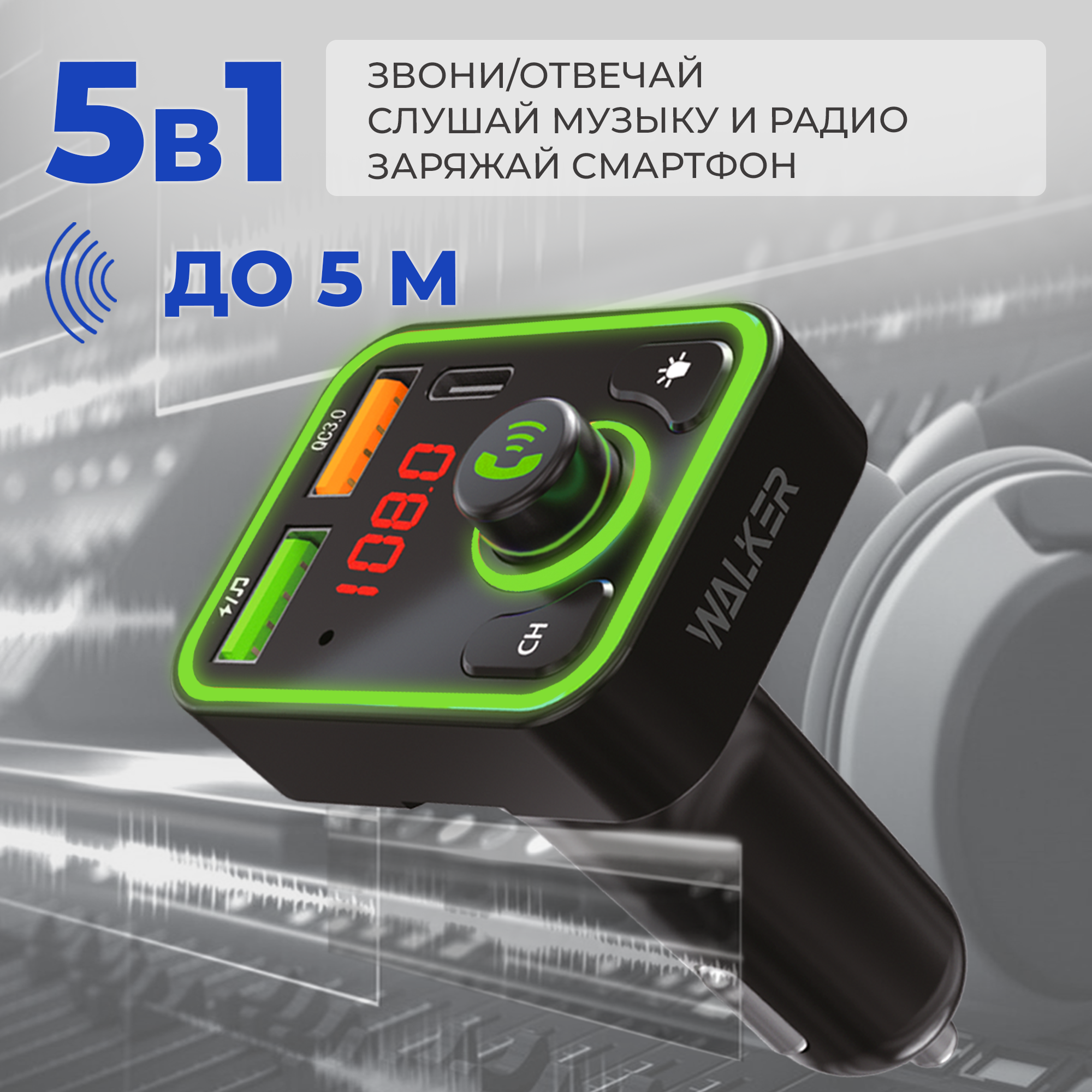 Купить FM трансмиттер с bluetooth, WALKER, WAFM-510, 2 USB, Type C, быстрая зарядка 18 и 25 Вт, фм audio transmitter для авто, автомобильное зу, черный