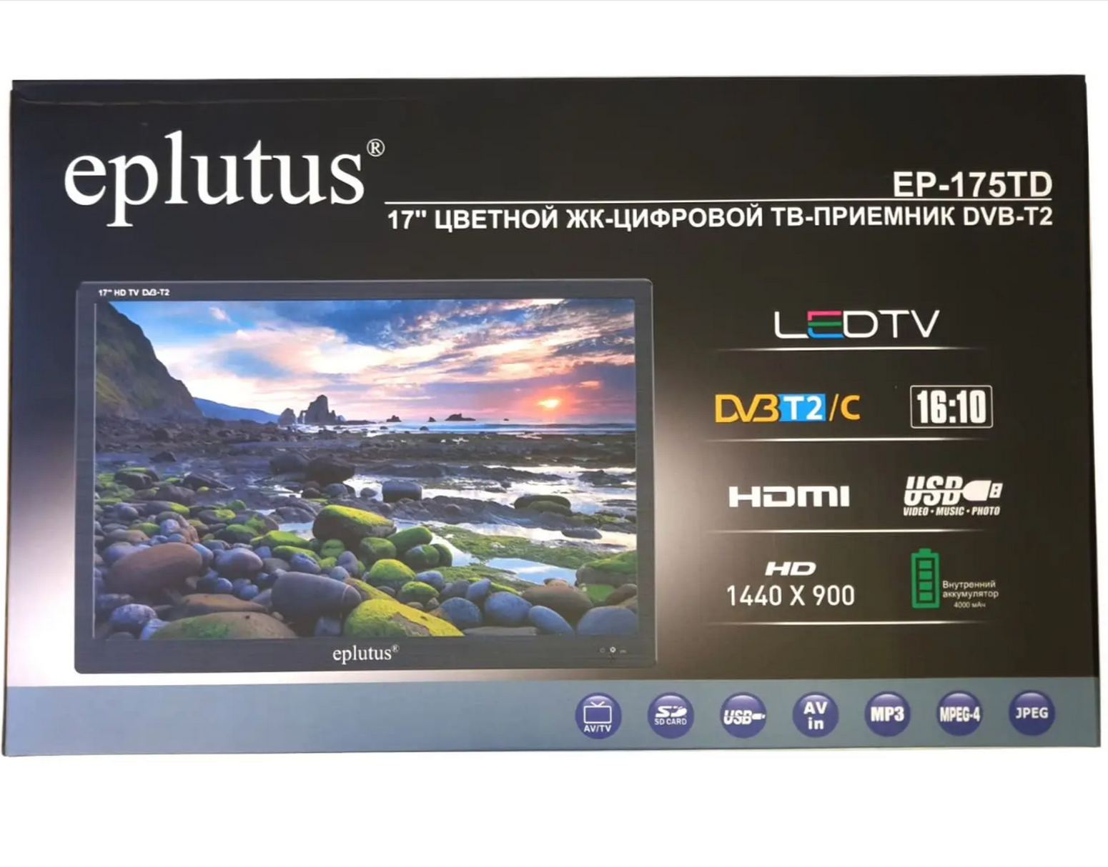 Портативный телевизор 1440x900, телевизор Eplutus Mod: EP-175(TD) (C75088OP) 17 HD, черный. Телевизор с цифровым тюнером и аккумулятором 4000 мАч.