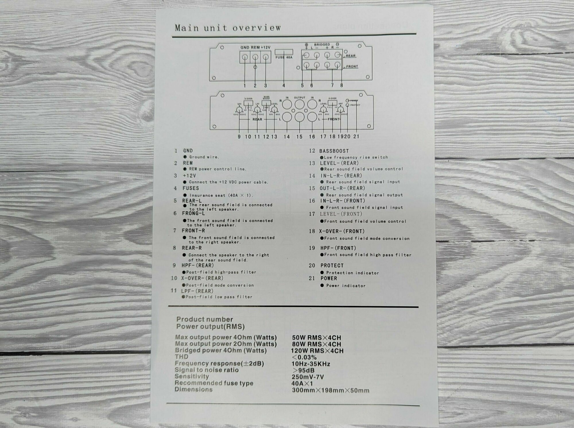 | Комплектация | Усилитель, Предохранитель 1 шт 40А, Саморезы для крепления 4 шт, Инструкция на английском, Коробка |