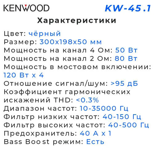 Усилитель автомобильный KENWOOD "KW-45.1", Макс. мощность 3000 Вт, 4-канальный, Класс A/B / Усилитель звука интересное: