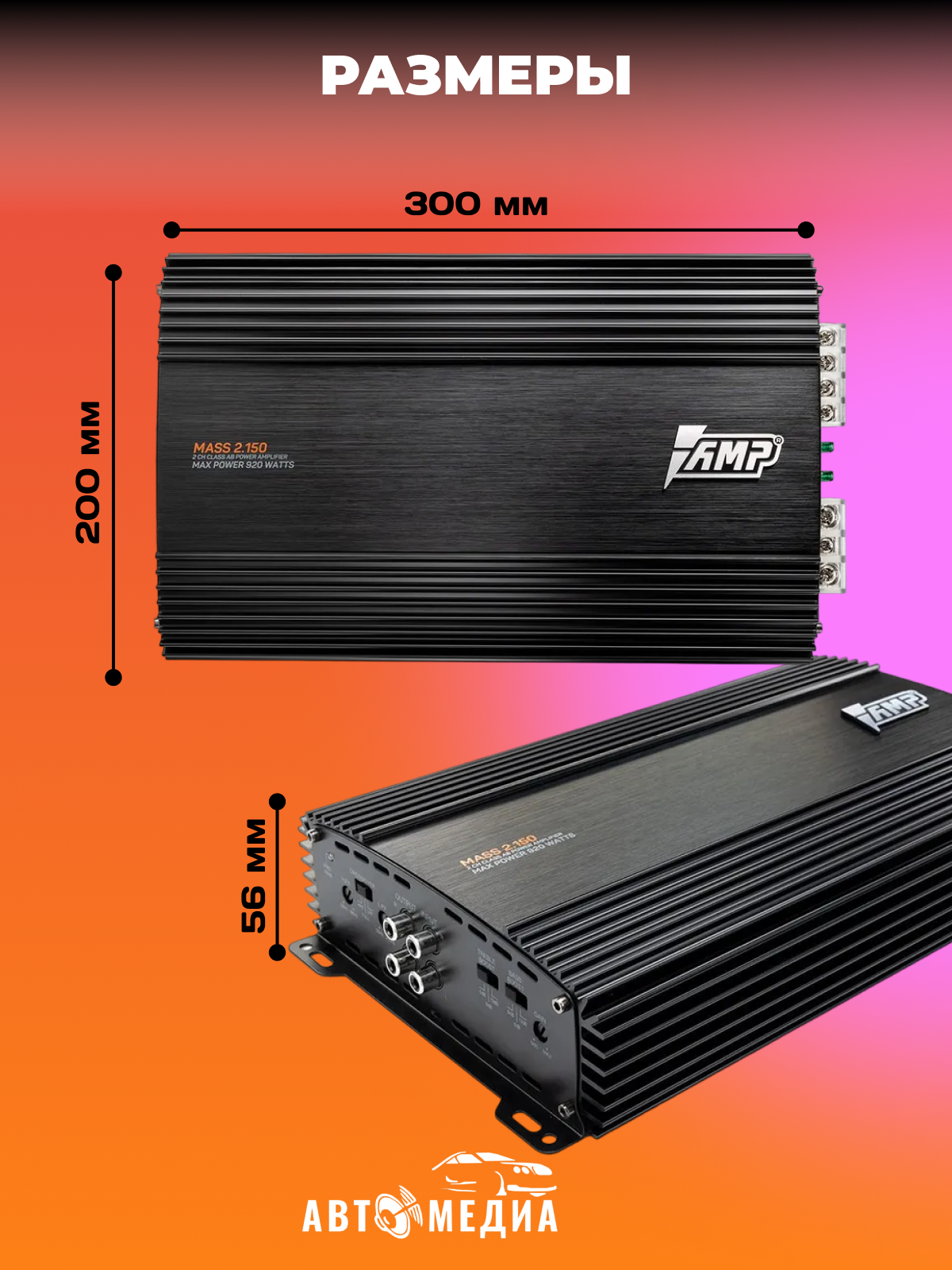 Усилитель автомобильный двухканальный AMP MASS 2.150 Класс АВ 2х150 Вт