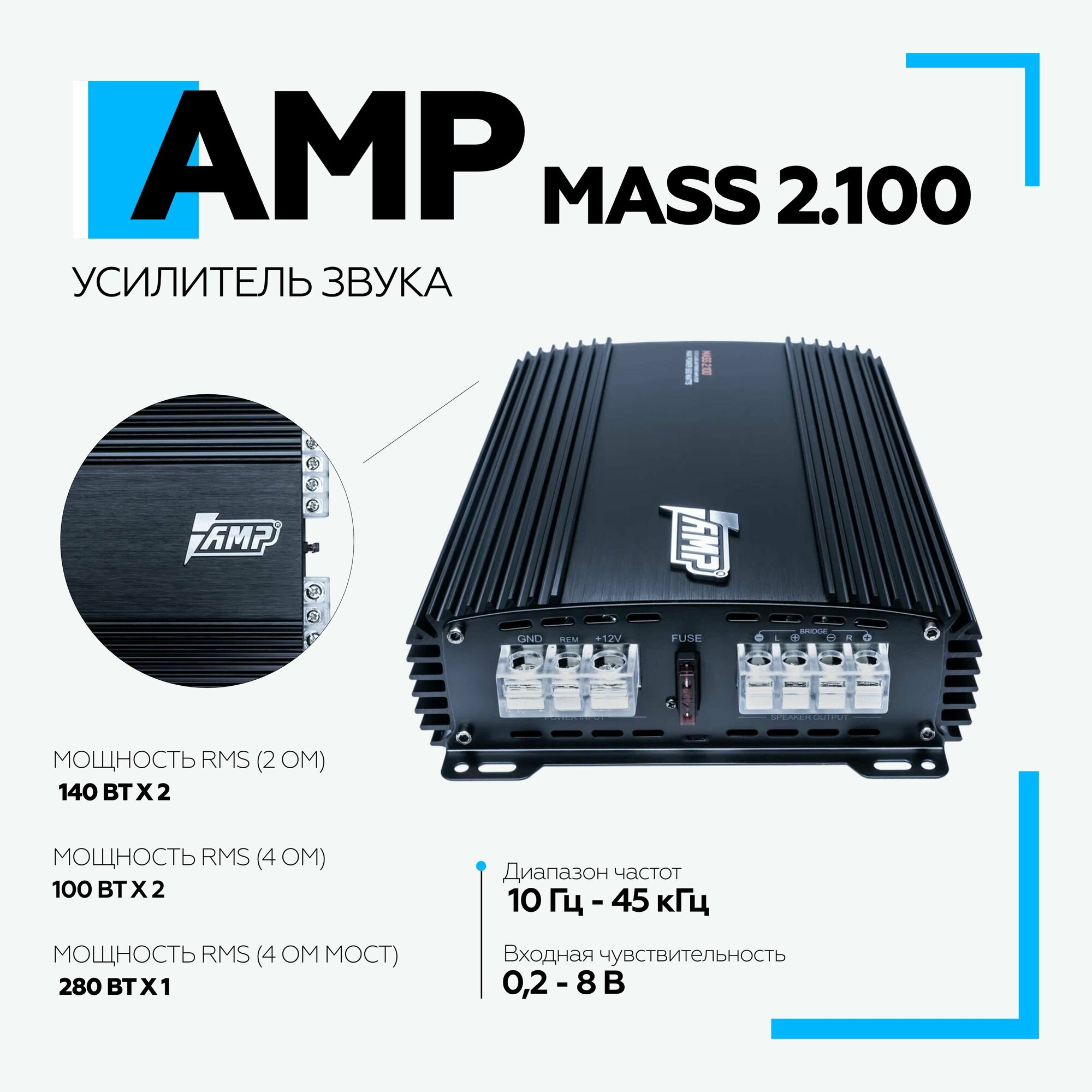 Автомобильный усилитель звука AMP MASS 2.100 двухканальный интересное: