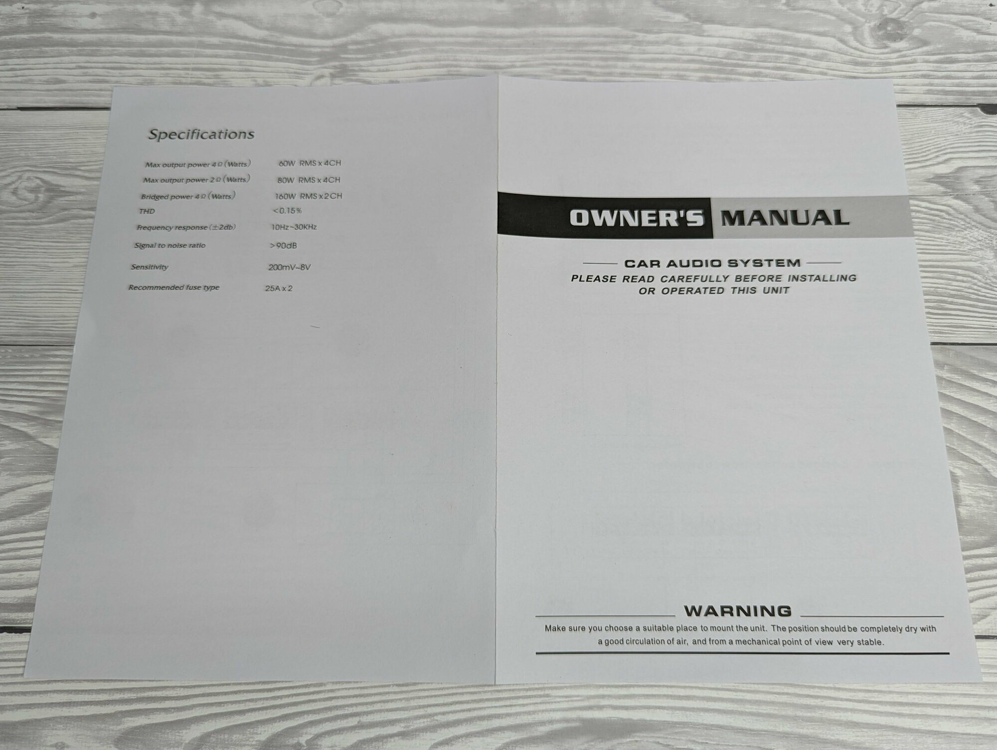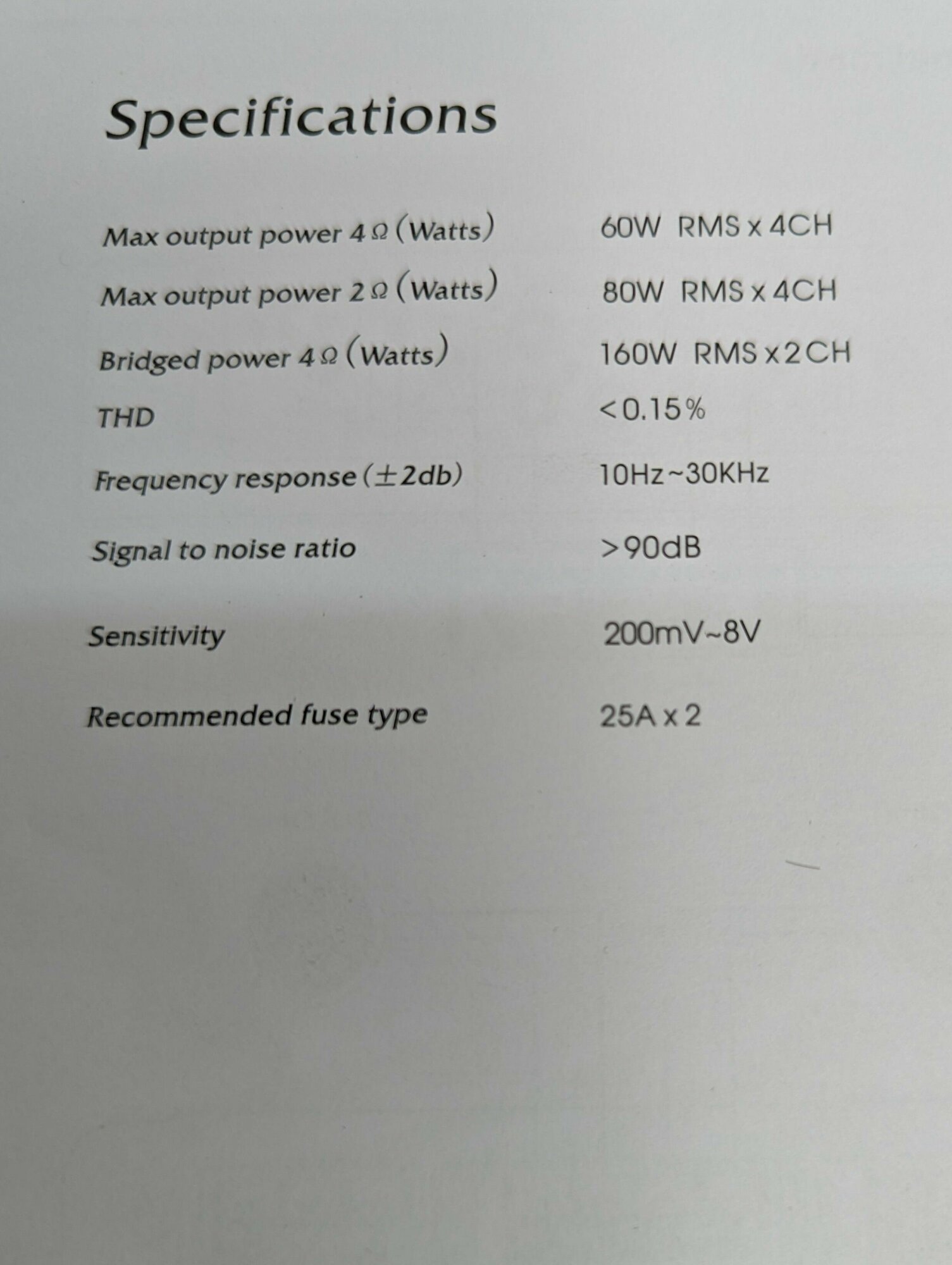 | Комплектация | Усилитель, Предохранитель 2шт по 25А, Саморезы для крепления 4шт, Инструкция на английском, Коробка |