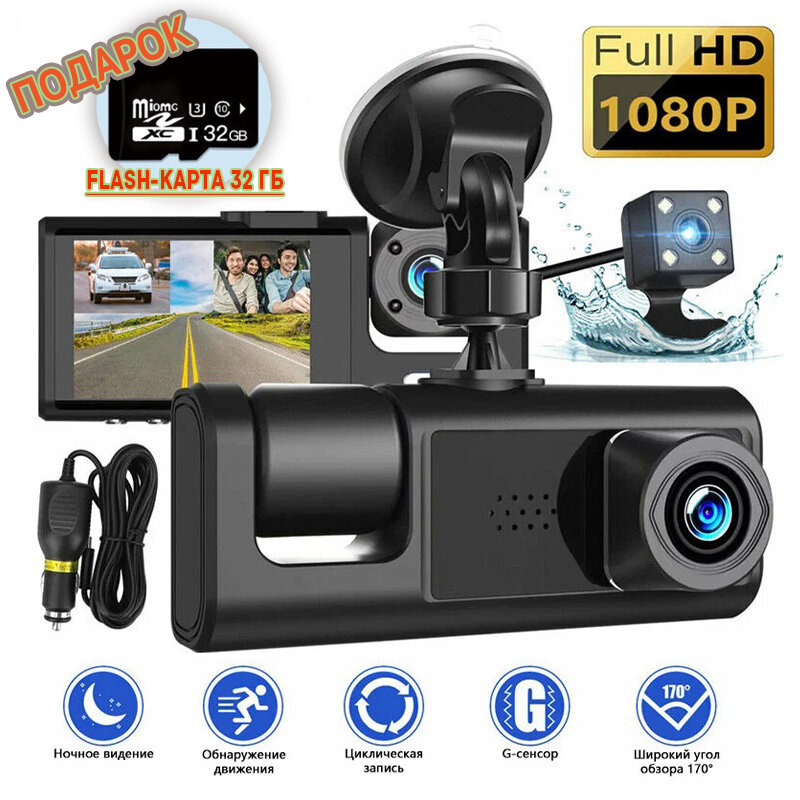 Автомобильный видеорегистратор Full HD 3-в-1 с камерой заднего вида и G-сенсором, FLASH-КAРТА 32 ГБ интересное: