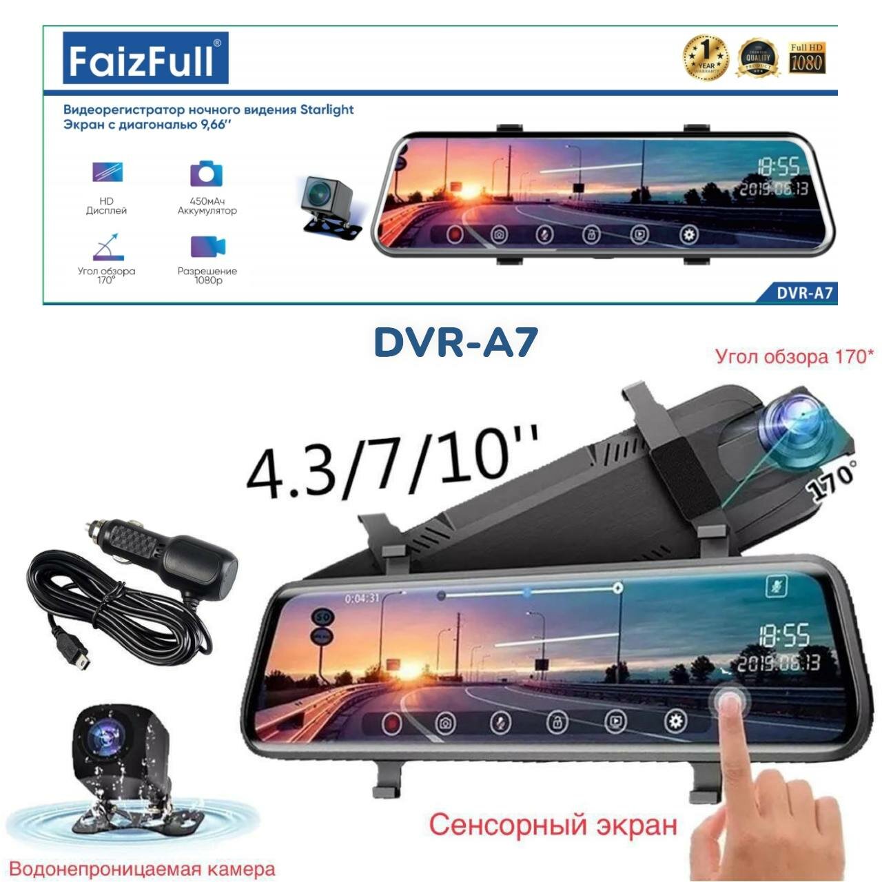 Видеорегистратор FAIZFULL / Сенсорное HD зеркало диагональю 9.66 / ночная съемка / контроль парковки / G-сенсор / русское меню интересное:
