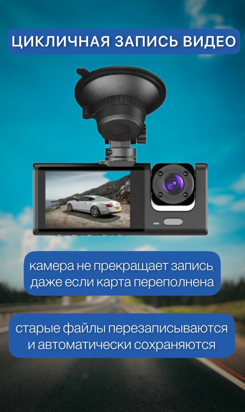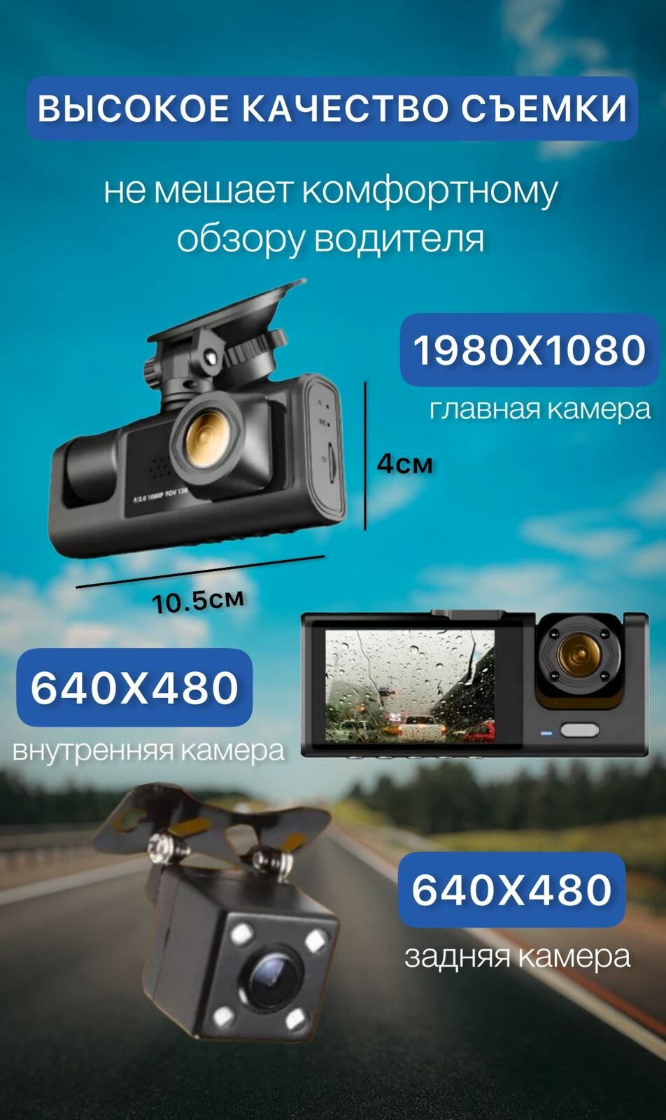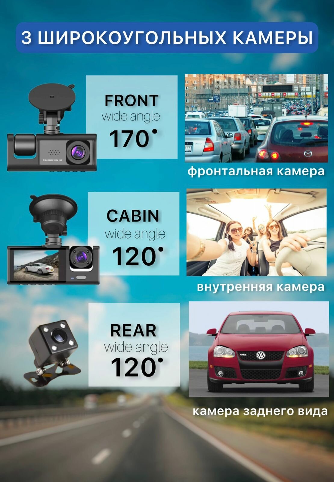 Видеорегистратор широкоугольный с 3-мя камерами( фронтальная, внутренняя, задняя). G-сенсор, FULL HD. интересное: