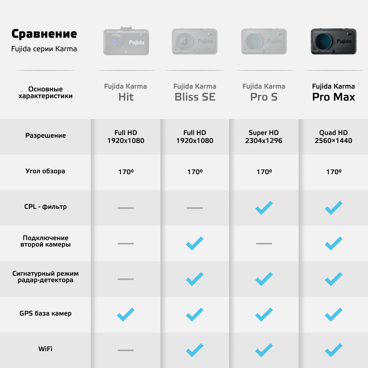 Видеорегистратор для автомобиля Fujida Karma Pro Max WiFi Quad HD с CPL-антибликовым фильтром, LNA, сигнатурным радар-детектором, GPS-информатором и WiFi-модулем