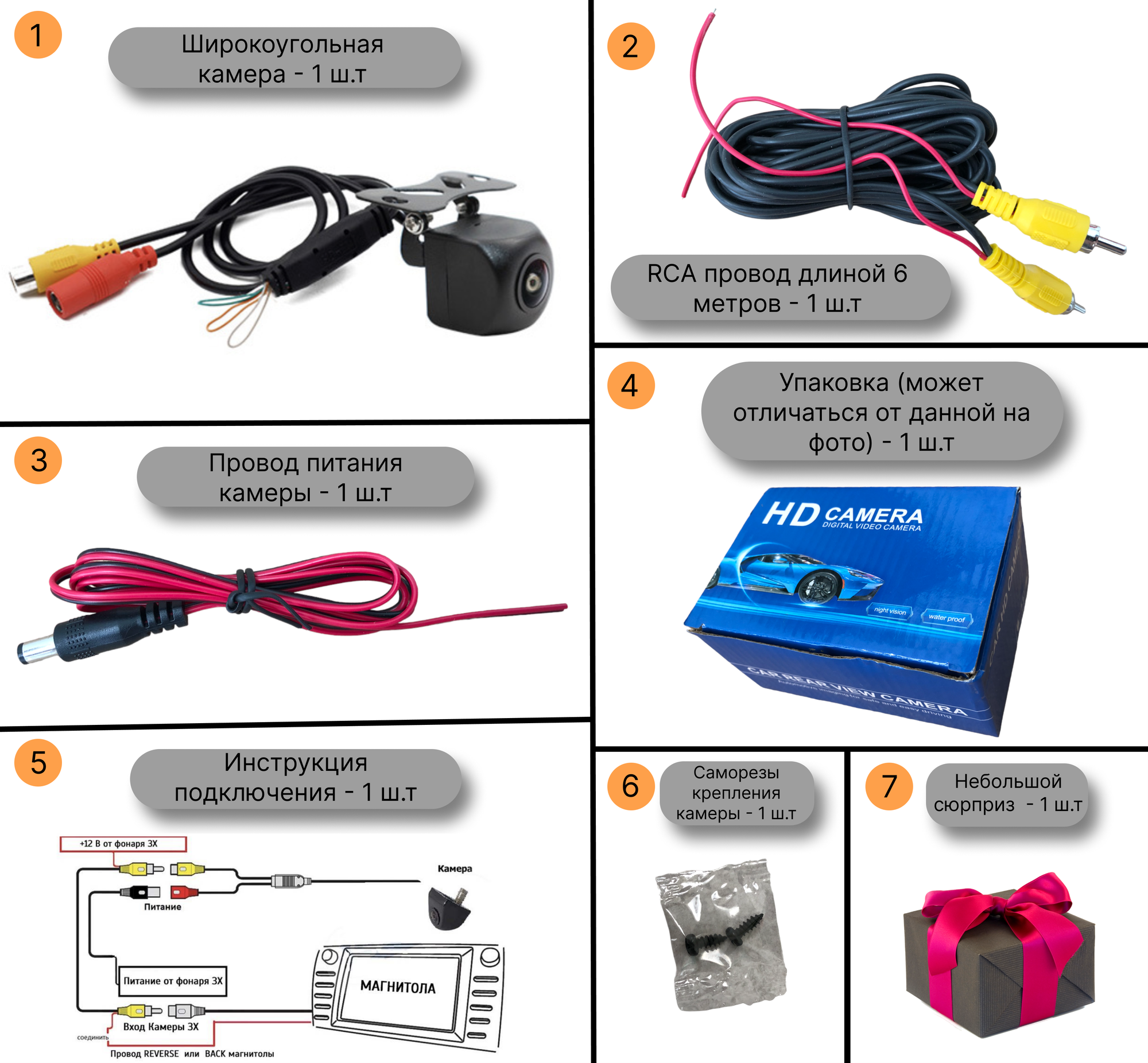 | Подробная комплектация | Автомобильная камера - 1 ш.т. Видео кабель RCA 6 м. - 1 ш.т. Кабель питания - 1 ш.т. Болты крепления - 2 ш.т. Инструкция - 1 ш.т. |