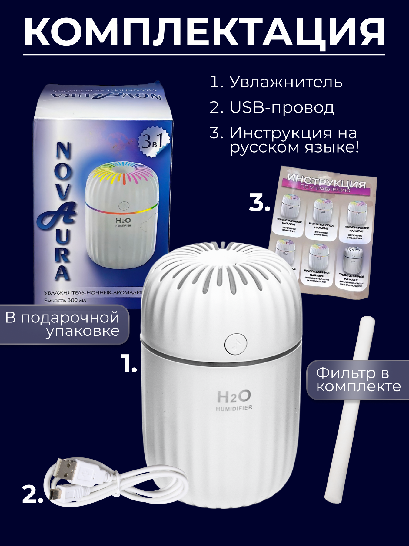 | Подробная комплектация | USB кабель-1 шт. ; Увлажнитель-1 шт. ; Инструкция- 1 шт. ; Подарочная коробка - 1 шт. |