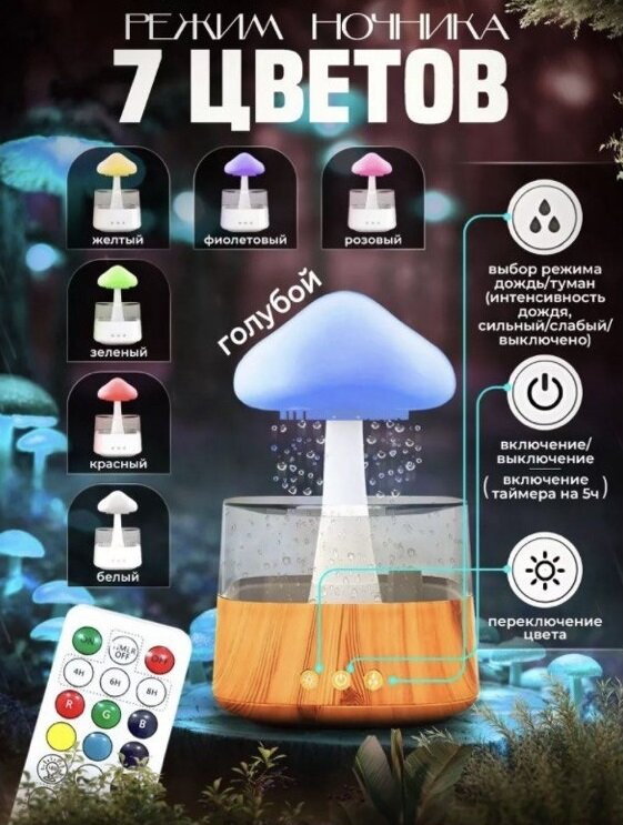 СохранитьУвлажнитель воздуха Гриб с функцией аромадиффузора и ночника с подсветкой / Эффект дождя/Синий интересное: