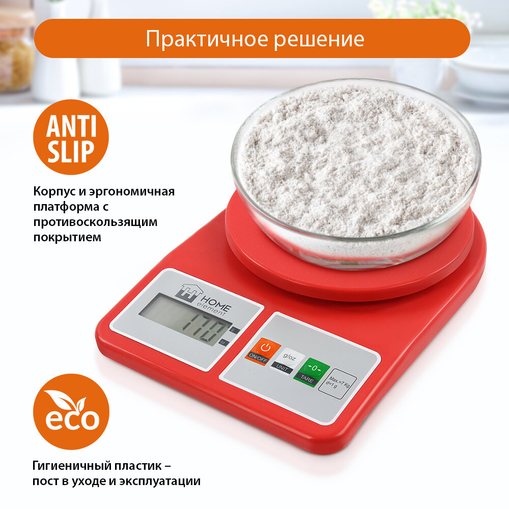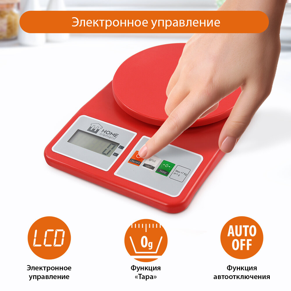 Весы кухонные Home Element / Хоум Элемент HE-SC930 электронные, пластик, красный, нагрузка до 7кг / для взвешивания продуктов / техника для кухни