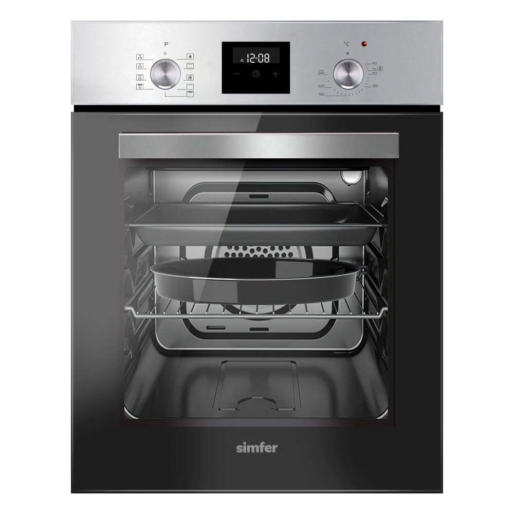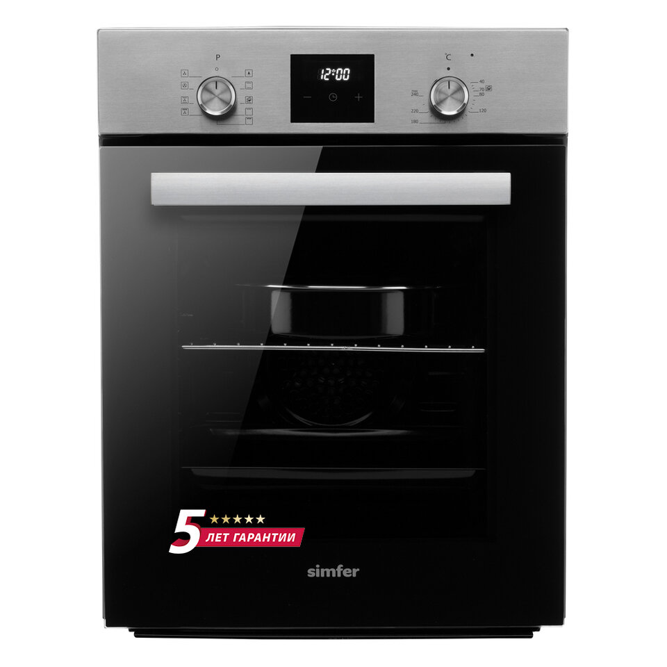 Электрический встраиваемый духовой шкаф Simfer, ширина 45см, 9 режимов, конвекция гриль, таймер + часы, 49 литров, подсветка, 2 противня + хромированная решётка, 5 лет гарантии