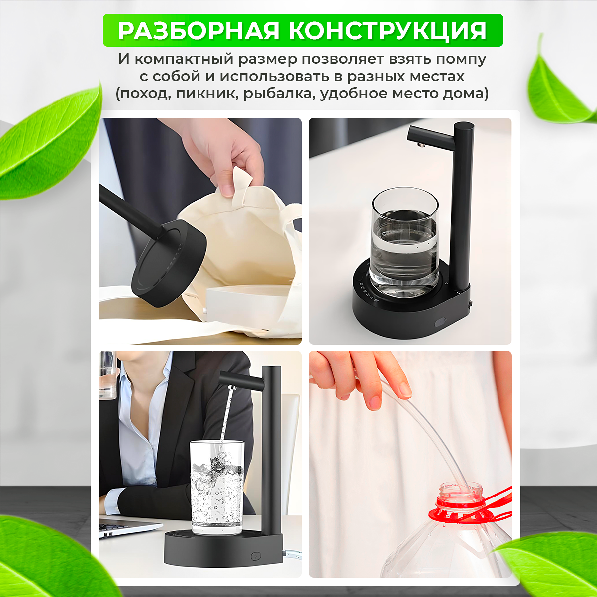 Помпа для воды электрическая настольная с подставкой, бесшумная работа, аккумулятор 1800 mah, для любых бутылей 19л, 10л, 6л, 5л, Черный интересное: