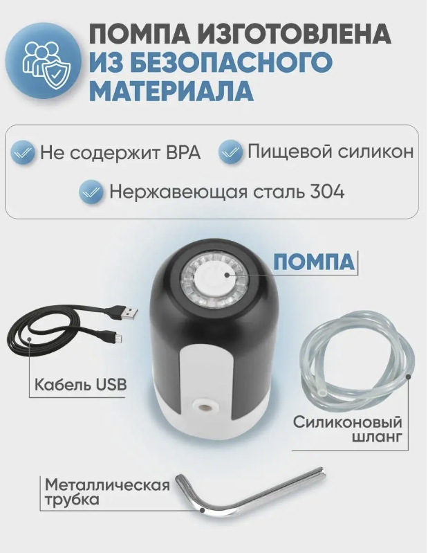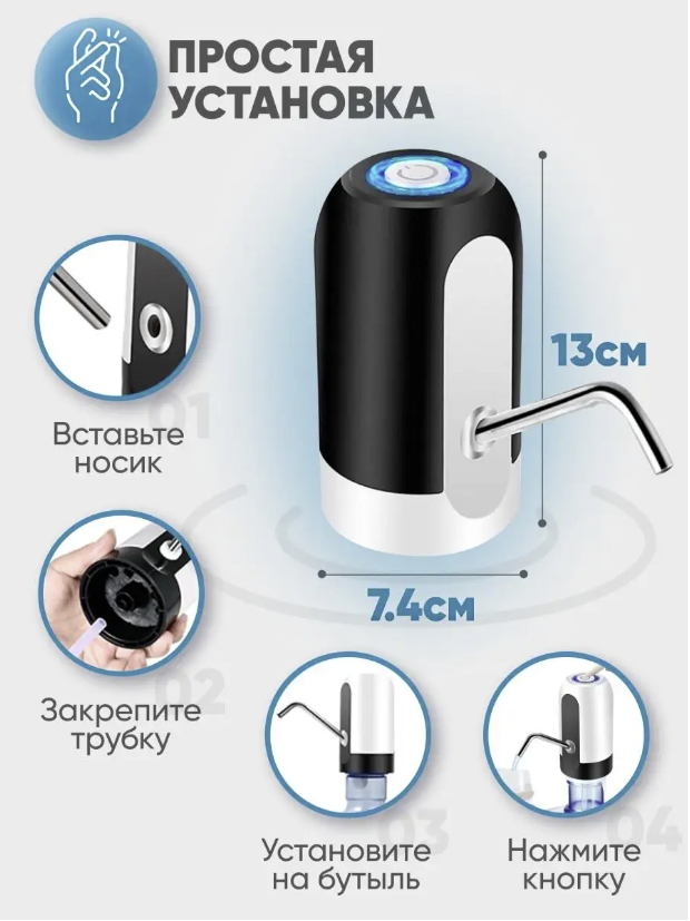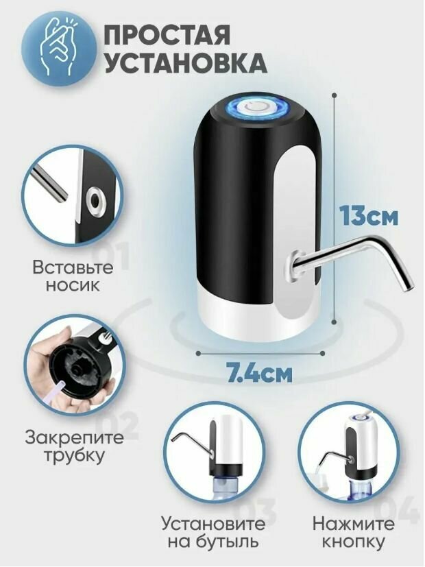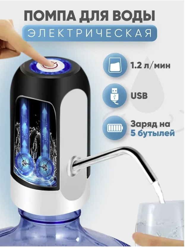 Помпа для воды электрическая автоматическая, электропомпа для бутылок беспроводная перезаряжаемая с зарядкой, черно-белая интересное: