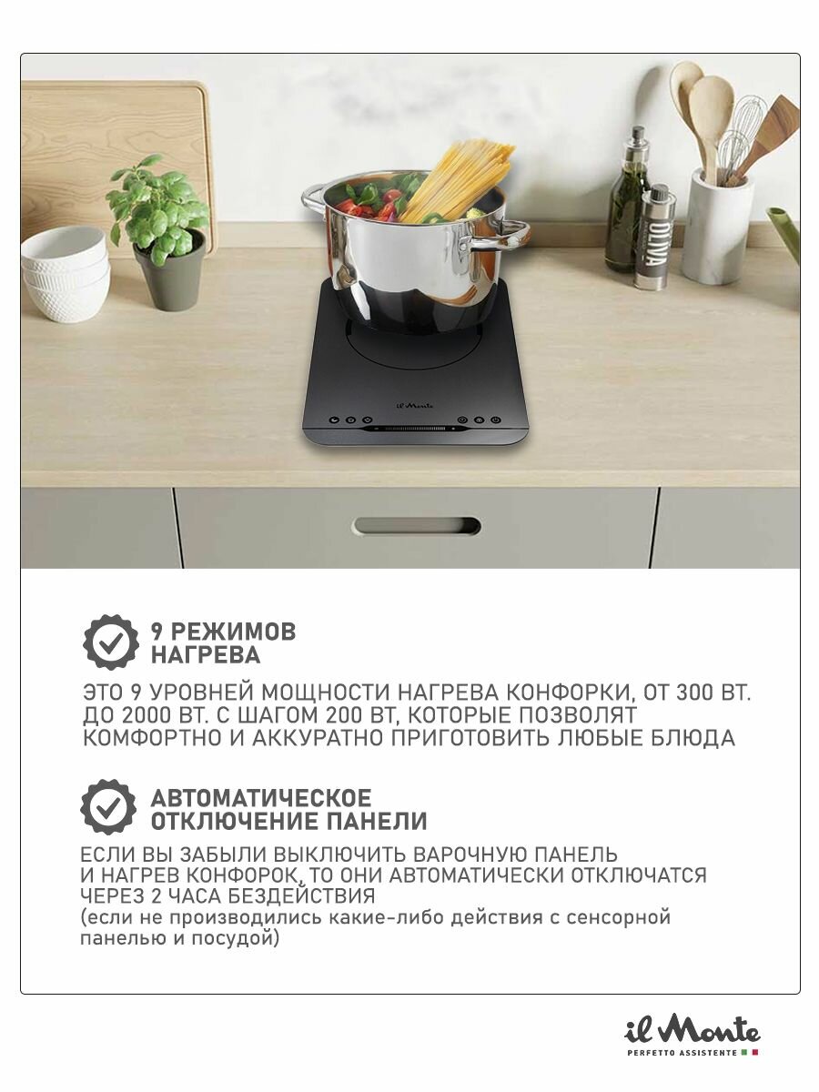 Индукционная плитка настольная, 2000 Вт, Быстрый нагрев, Механическое управление, il Monte TH-101-IH