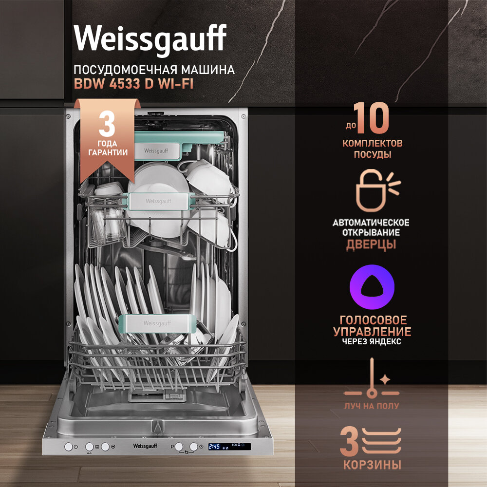 Умная встраиваемая посудомоечная машина с Wi-Fi, лучом на полу и авто-открыванием Weissgauff BDW 4533 D Wi-Fi интересное: