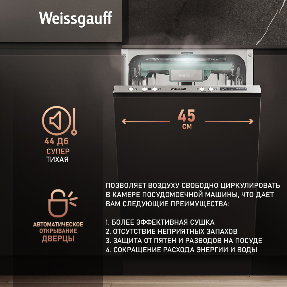 Умная встраиваемая посудомоечная машина с Wi-Fi, лучом на полу, авто-открыванием и инвертором Weissgauff BDW 4573 D Wi-Fi (модификация 2024 года) интересное: