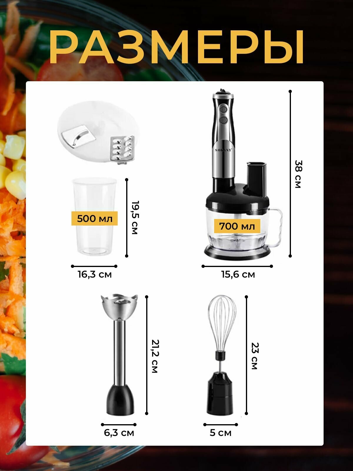 | Насадки | венчик для взбивания / для приготовления пюре / измельчитель / кофемолка / насадка для шинковки / терка |
