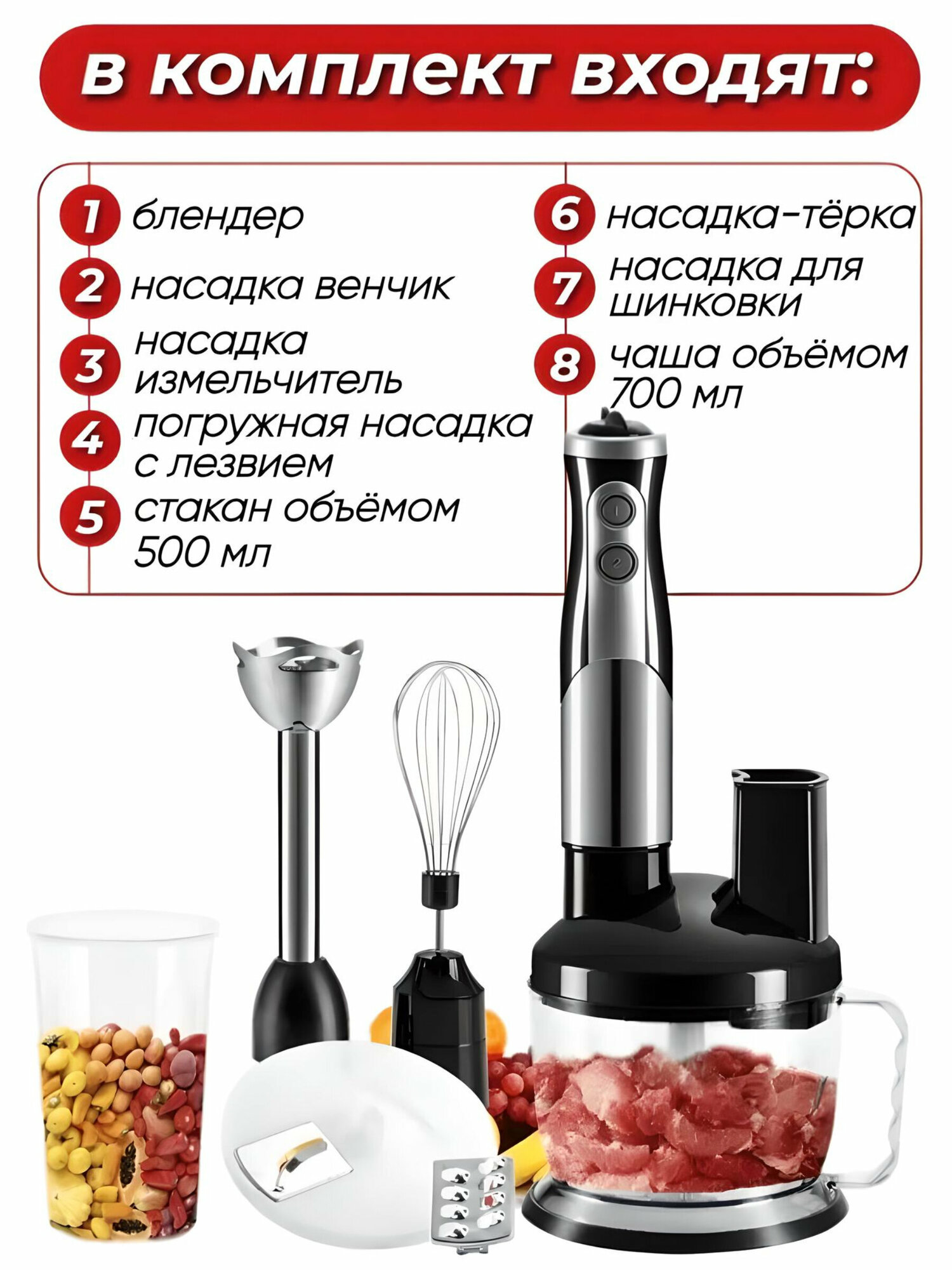 Погружной блендер 8в1, 700Вт, 2 скорости, блендер для смузи, блендер кухонный /насадка: измельчитель, венчик, погружная, терка, для шинковки/ 5011-8 интересное: