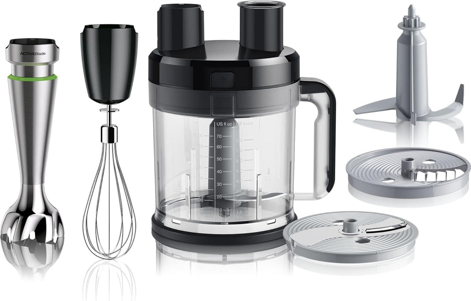 | Насадки | венчик для взбивания / диск для нарезки ломтиками / для замешивания теста / измельчитель / насадка для шинковки / терка |