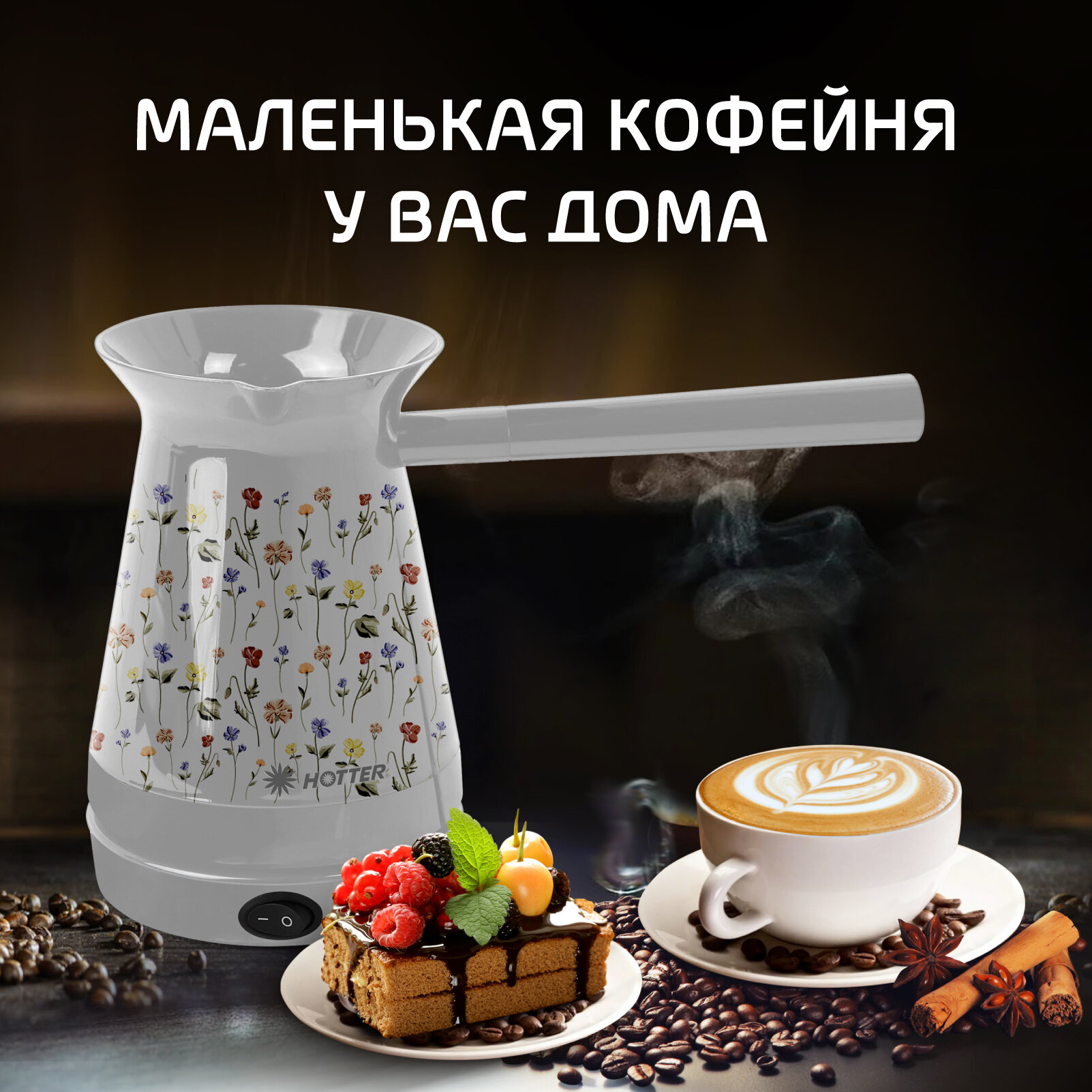Турка электрическая HOTTER с автоподогревом и смарт-контролем, белая с дизайном "Цветы" интересное: