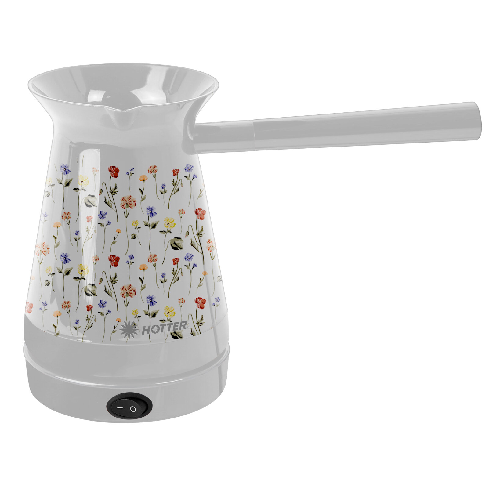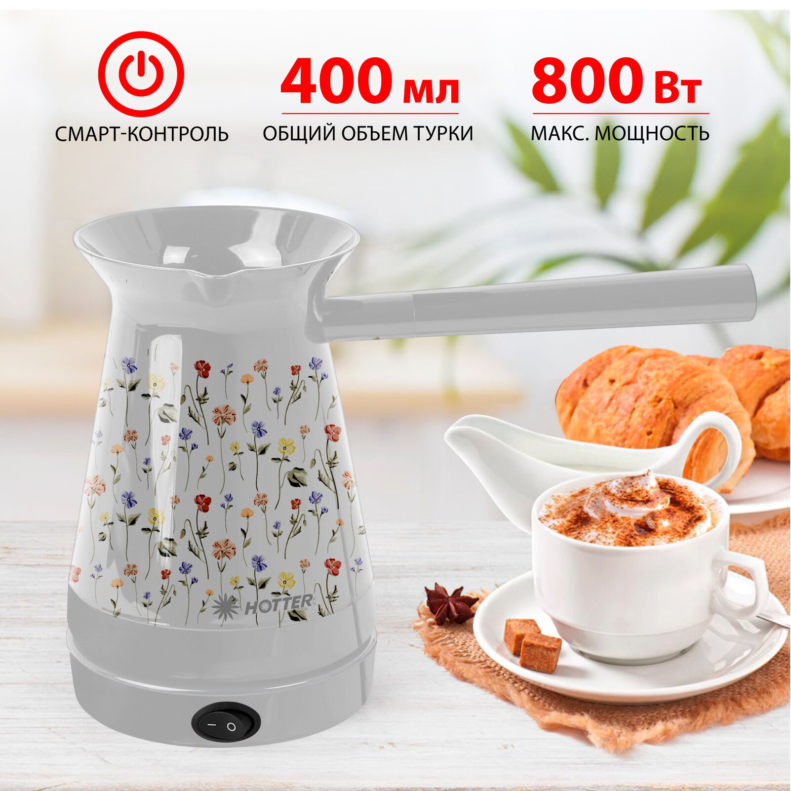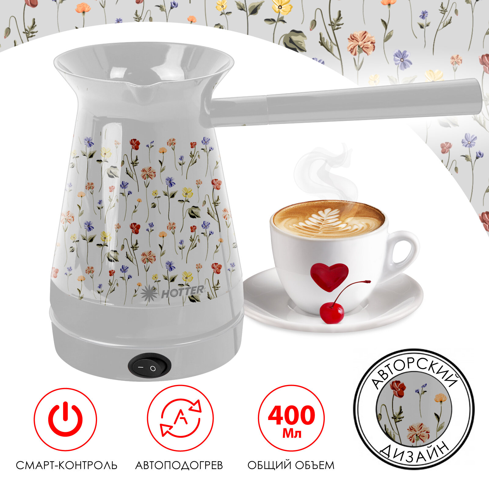 Купить Турка электрическая HOTTER с автоподогревом и смарт-контролем, белая с дизайном "Цветы"