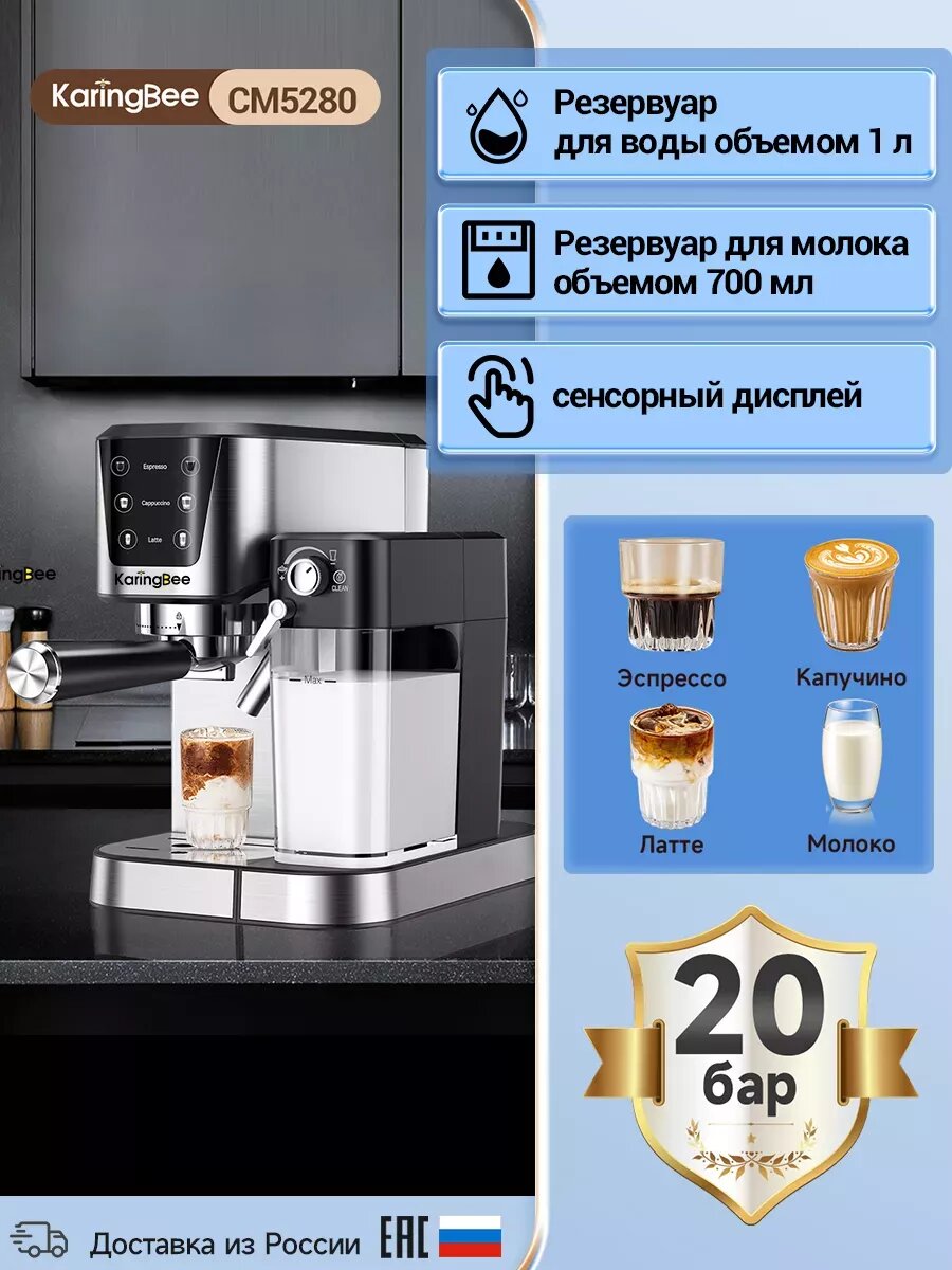 Полуавтоматическая кофемашина KaringBee CM5280 с черно-белым сенсорным дисплеем, серебристого цвета