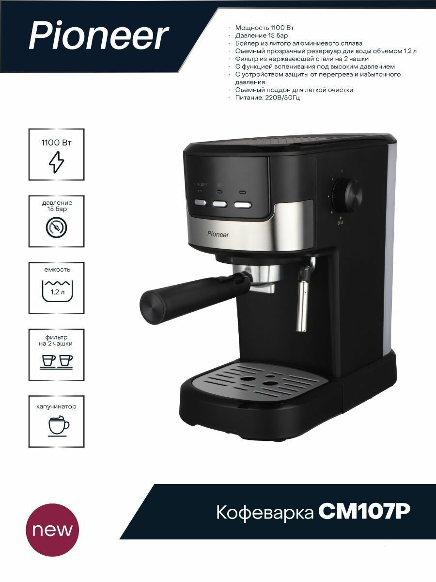 Кофеварка рожковая профессиональная Pioneer CM107P с капучинатором и фильтром, на 2 порции, резервуар для воды 1,2 л, 1100 Вт интересное:
