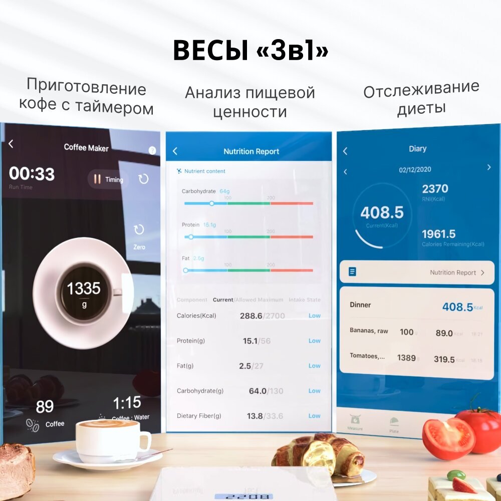 | Дополнительная информация | Синхронизация данных через Bluetooth с мобильным приложением о типах потребляемой пищи и калориях,анализ питания,получение рекомендаций от приложения,постановка целей,таймер для варки кофе (в приложении),дневник питания,сброс веса тары |