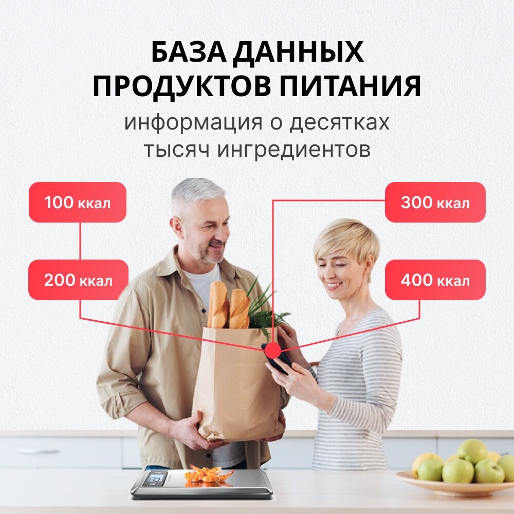 | Дополнительная информация | Синхронизация данных через Bluetooth с мобильным приложением о типах потребляемой пищи и калориях,анализ питания,получение рекомендаций от приложения,постановка целей,таймер для варки кофе (в приложении),дневник питания,сброс веса тары |