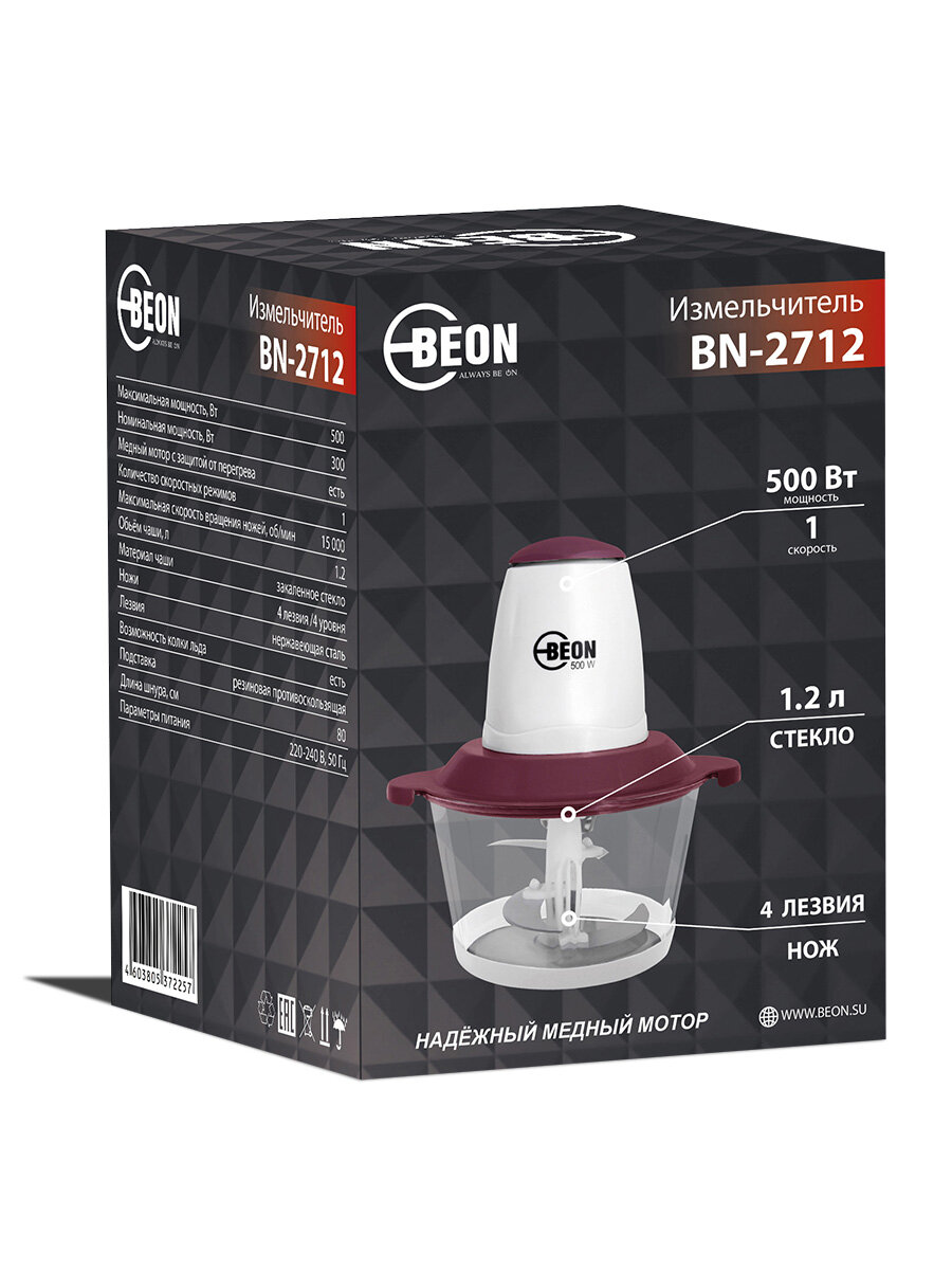 Измельчитель электрический BEON BN-2712, чаша стекло 1.2л, 500Вт, 15000 об/мин, многоуровневые ножи/4 лезвия