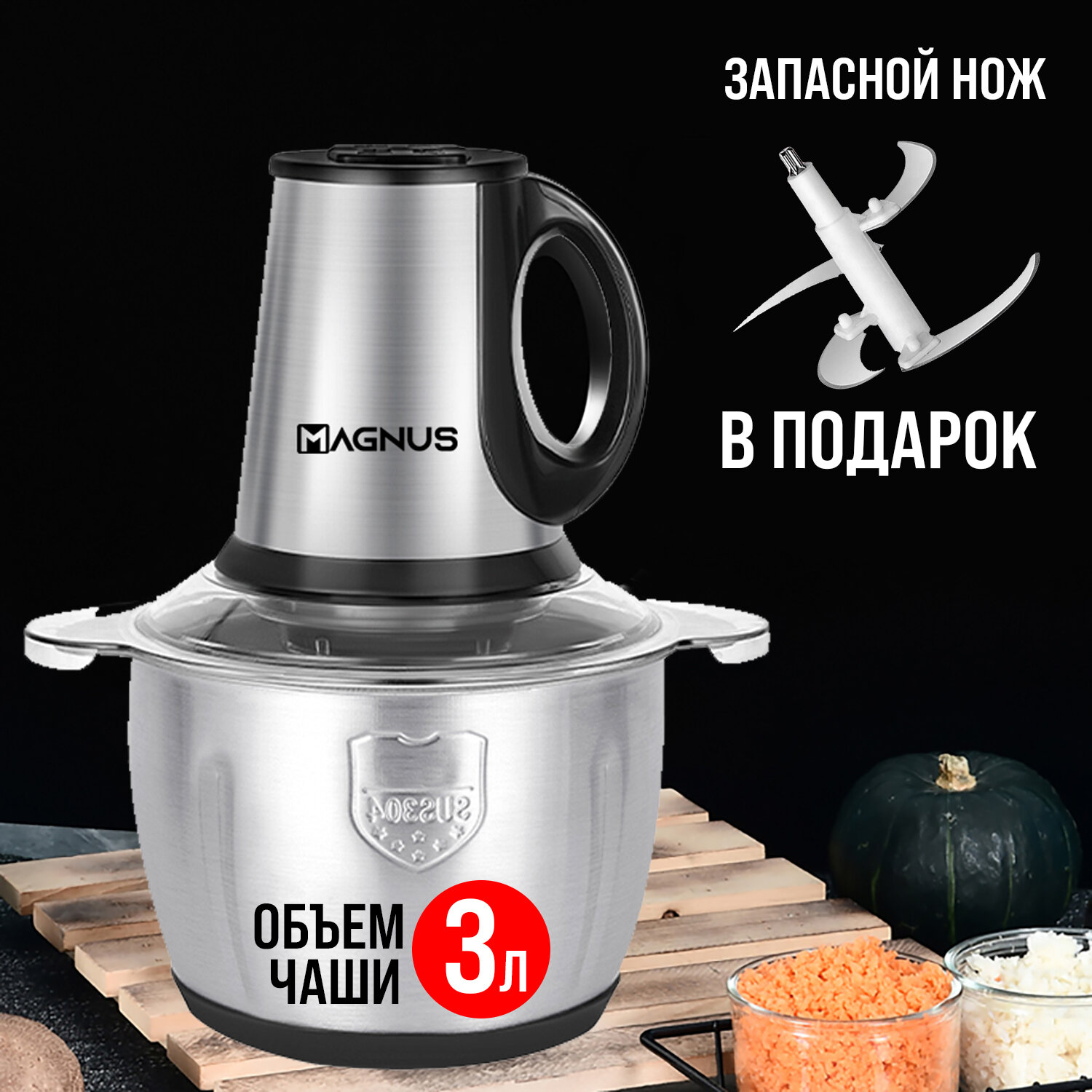 Купить Электрический измельчитель MAGNUS M3 Мощность 800 Вт Объем чаши 3 л. Запасной нож в подарок