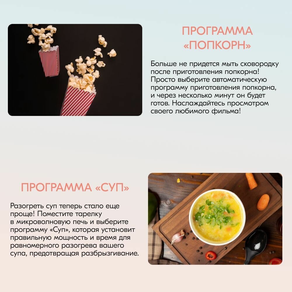 | Дополнительные режимы | автоматическая разморозка / автоматическое приготовление / звуковой сигнал отключения / режим удаления запахов / экспресс-режим приготовления |