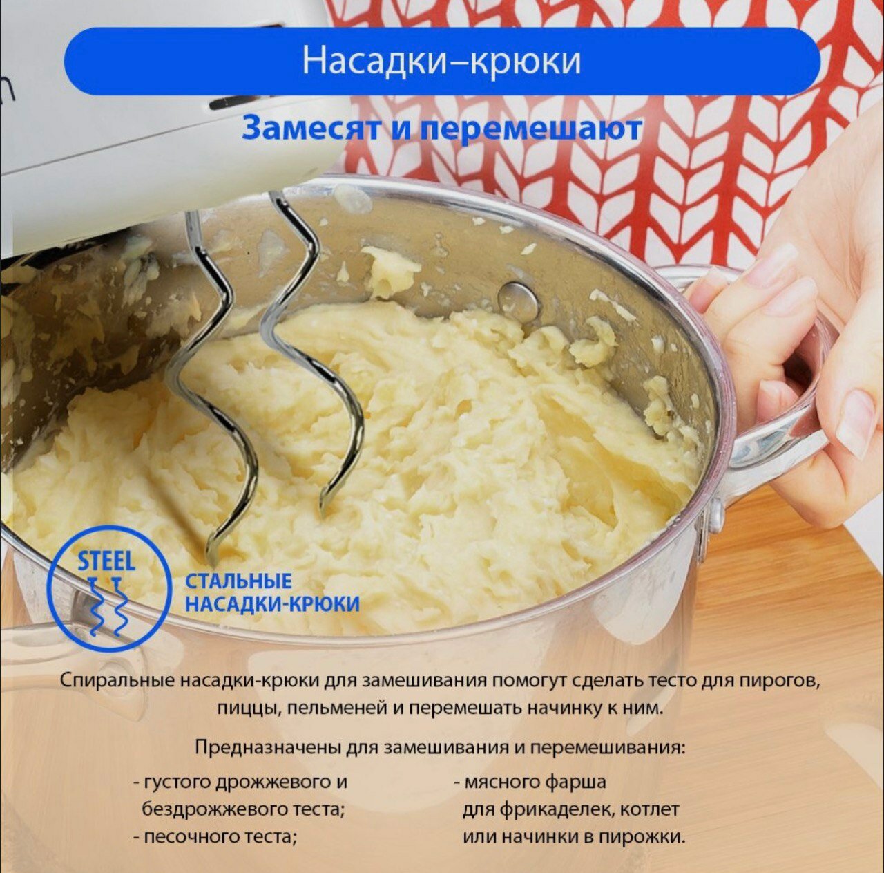 | Насадки | венчик для взбивания / крючки для замешивания теста |
