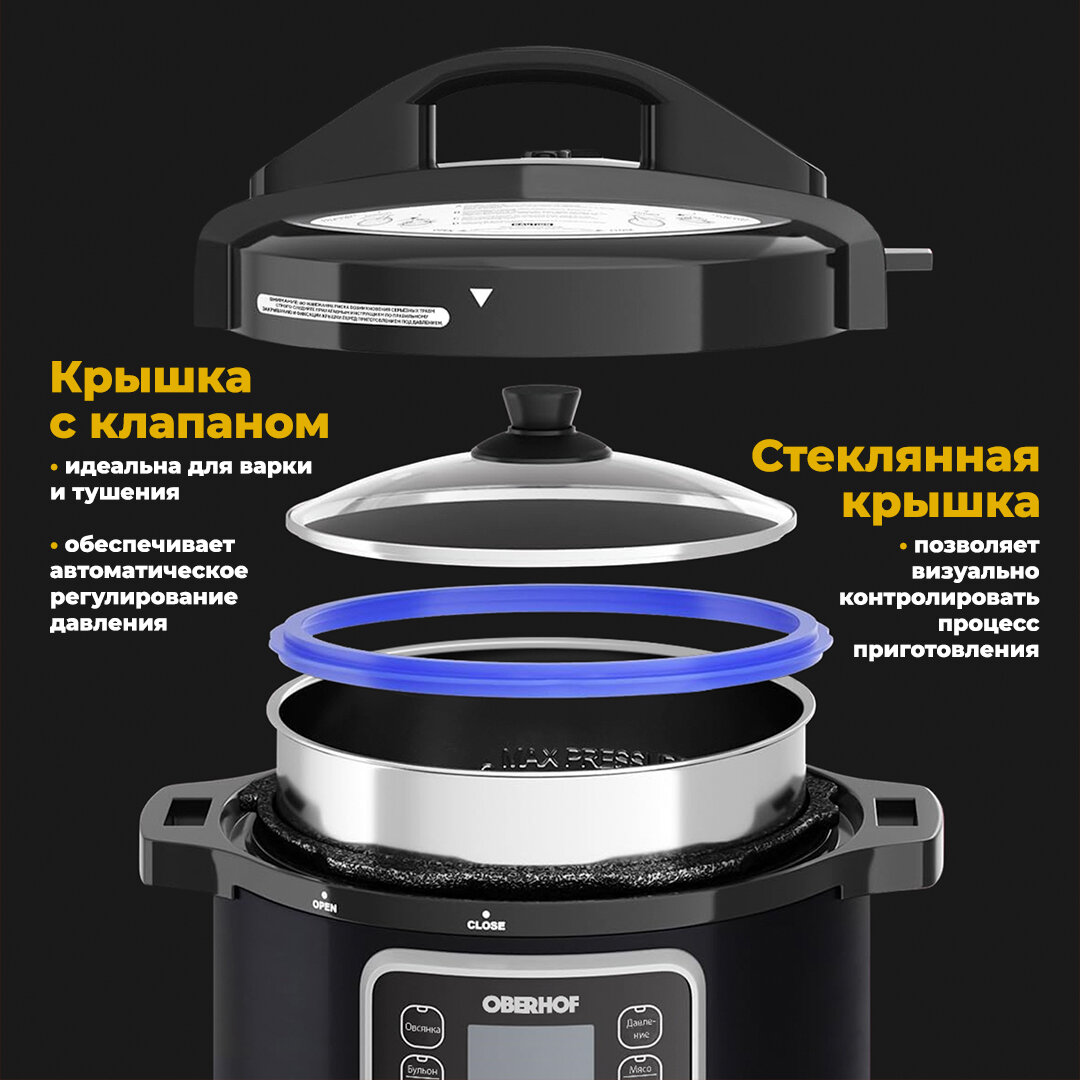 Купить Умная мультиварка 6 литров, скороварка, пароварка, йогуртница, 15 программ, 2 крышки в комплекте (стеклянная и с клапаном), антипригарное покрытие OBERHOF Hausmannskost M-15