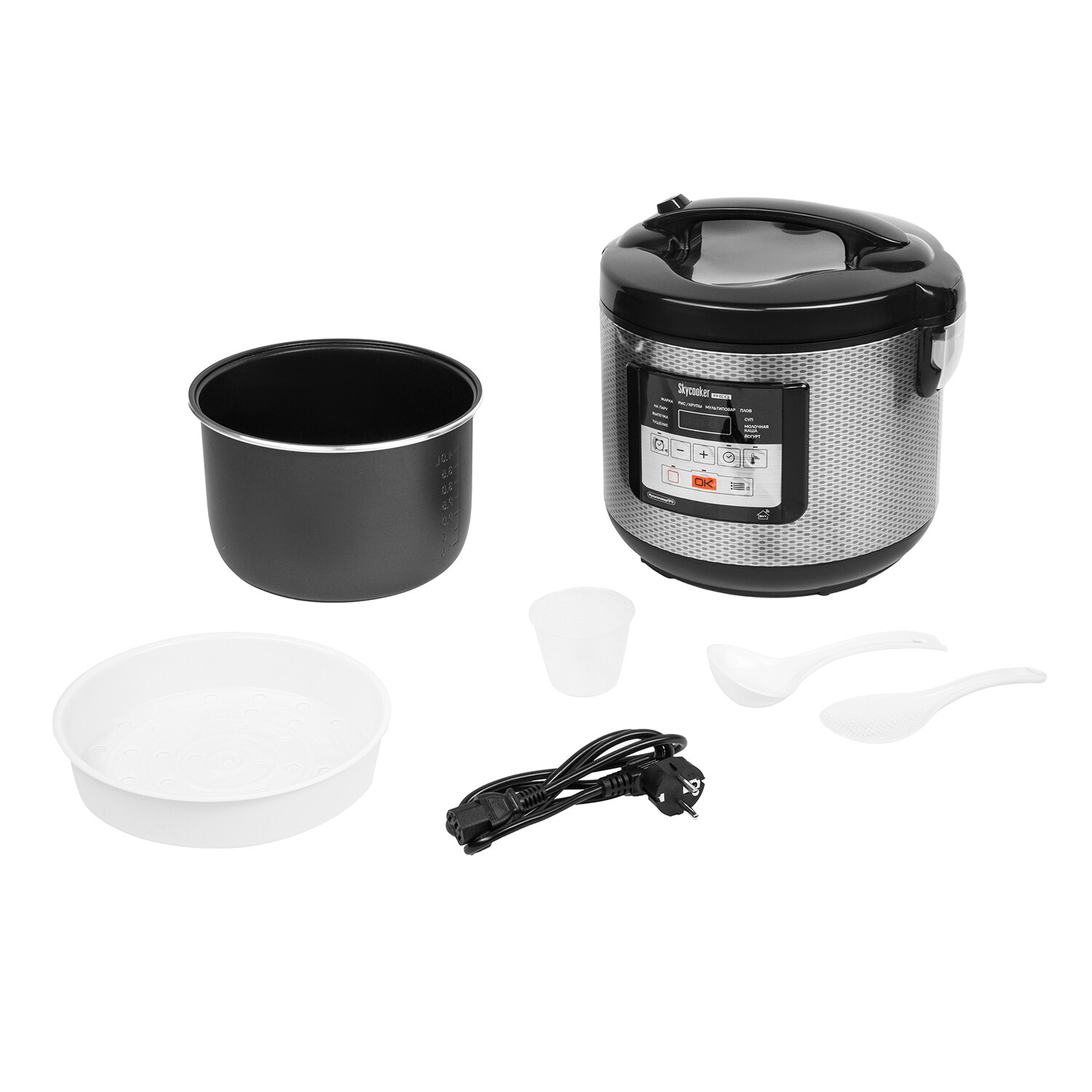 | Подробная комплектация | мультиварка с установленной внутрь чашей, контейнер для приготовления на пару, черпак, плоская ложка, мерный стакан, шнур электропитания, книга рецептов, руководство по эксплуатации, сервисная книжка |