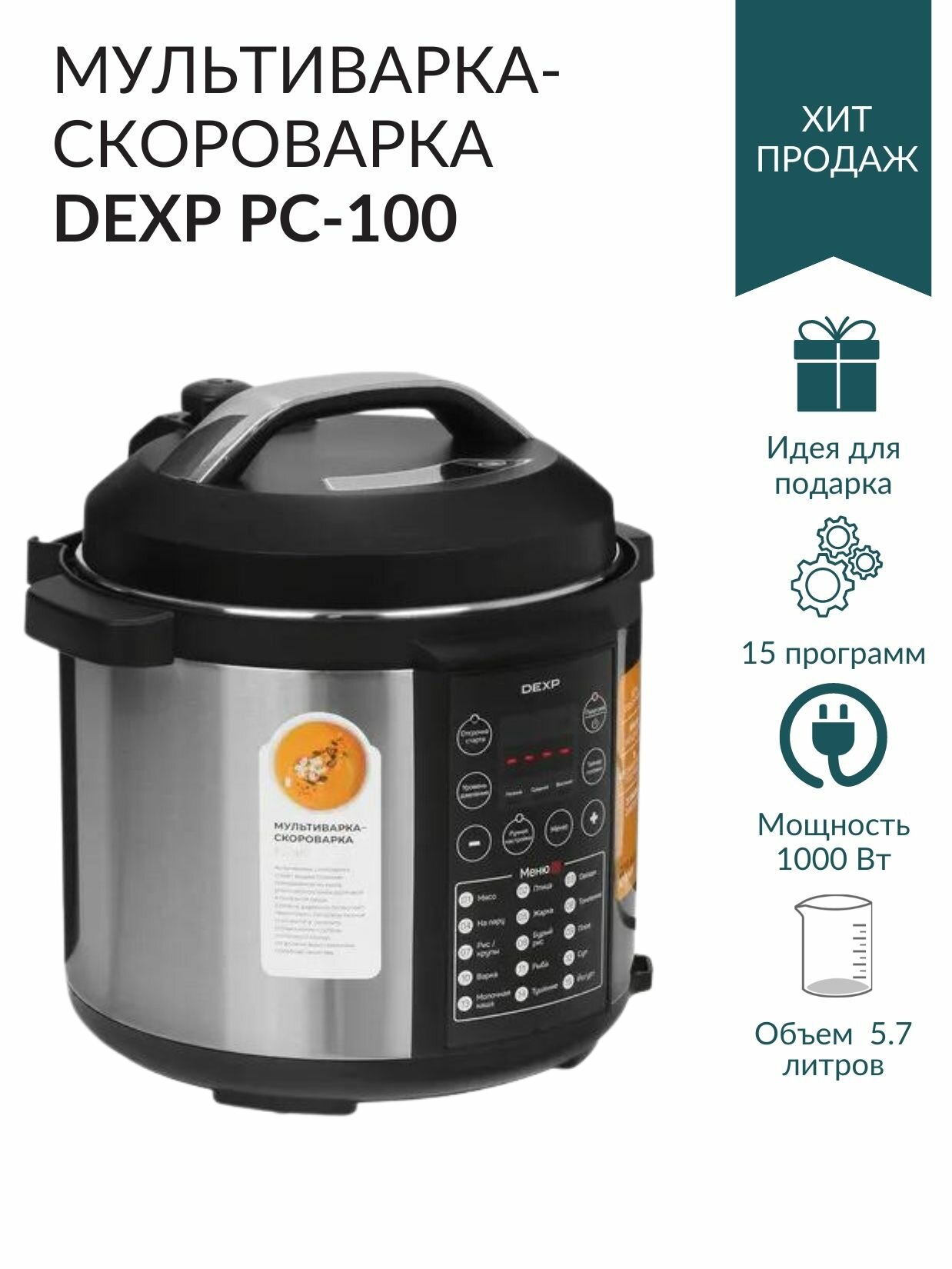 Мультиварка-скороварка DEXP PC-100 (5.7 л, 1000 Вт, программ - 15) , серебристый
