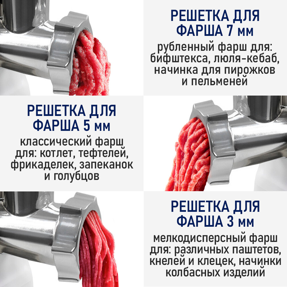 | Насадки | диск для фарша / насадка для кеббе / насадка для приготовления колбас / соковыжималка |