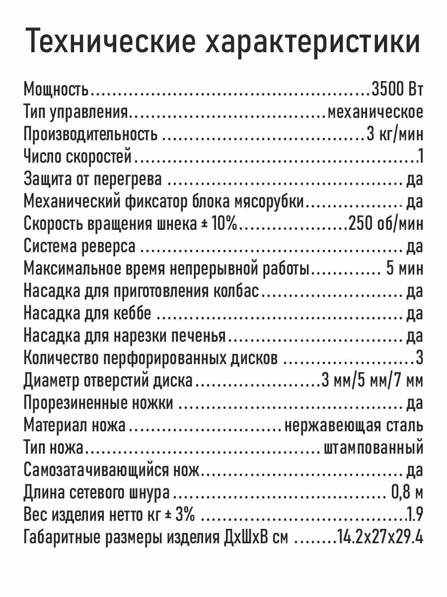 | Насадки | насадка для кеббе / насадка для приготовления колбас |