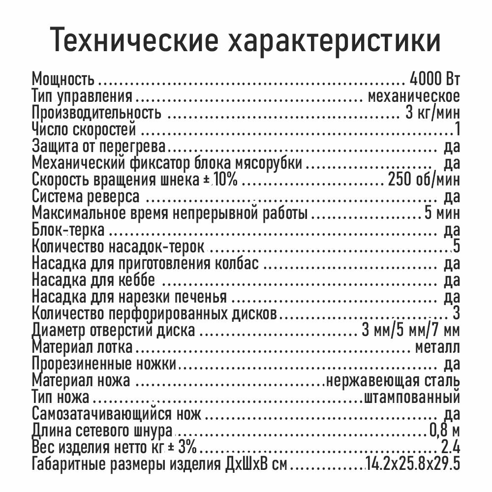 | Насадки | диск для фарша / насадка для кеббе / насадка для нарезки печенья / насадка для приготовления колбас / насадка-терка |