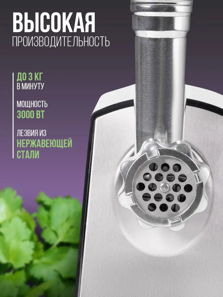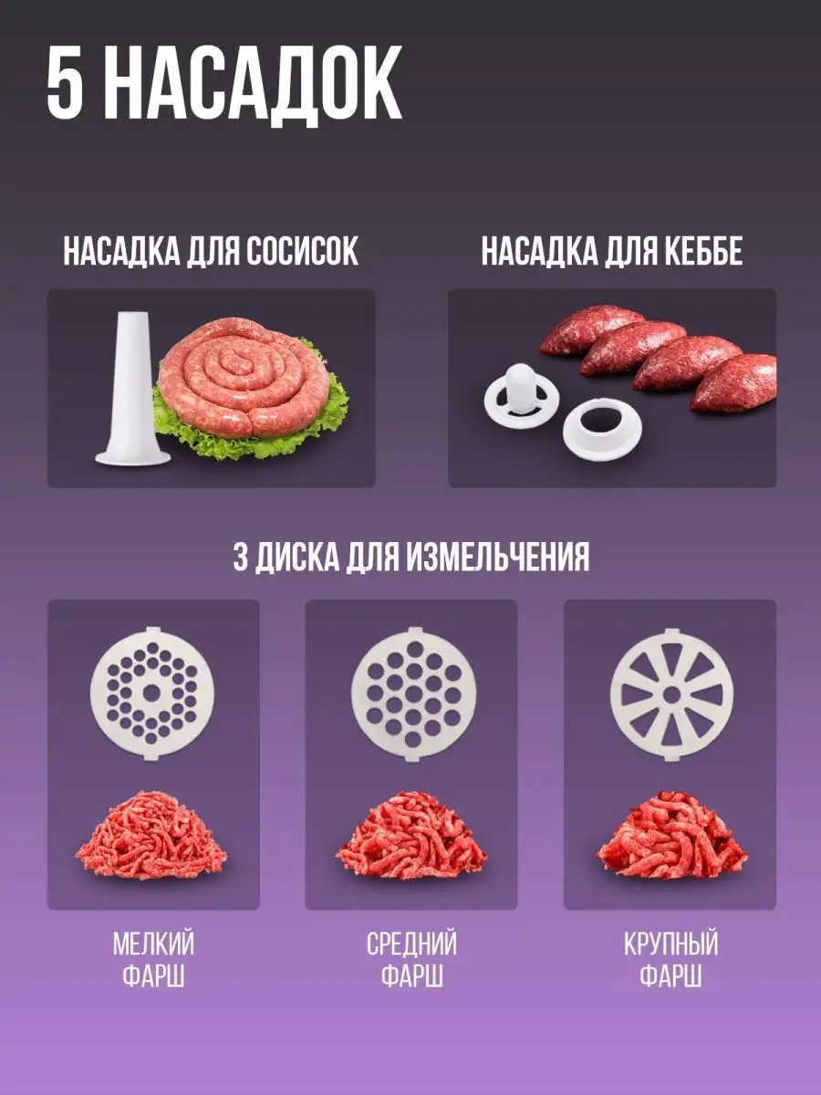 | Насадки | диск для фарша / насадка для кеббе / насадка для приготовления колбас / насадка для шинковки / формочка для фарша |