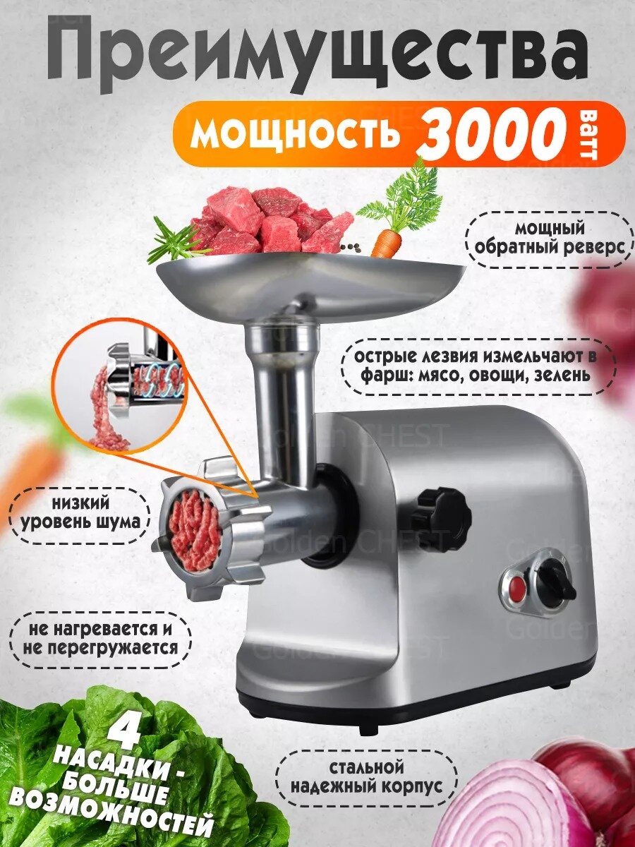Мясорубка ,мясорубка электрическая для фарша,серая,3000Вт,функция реверс,3 диска нарезки,насадки для кеббе,колбас,сосисок,домашняя мясорубка интересное: