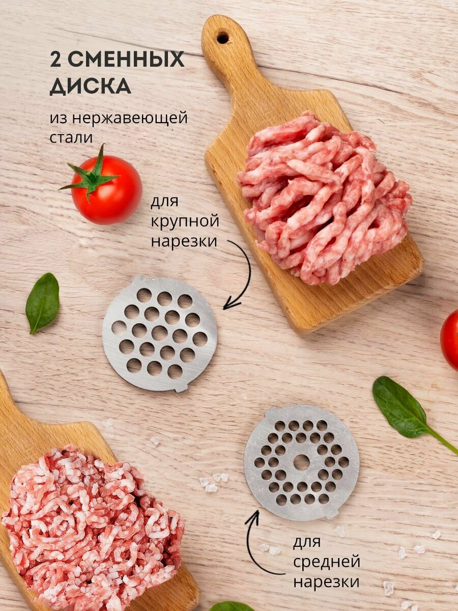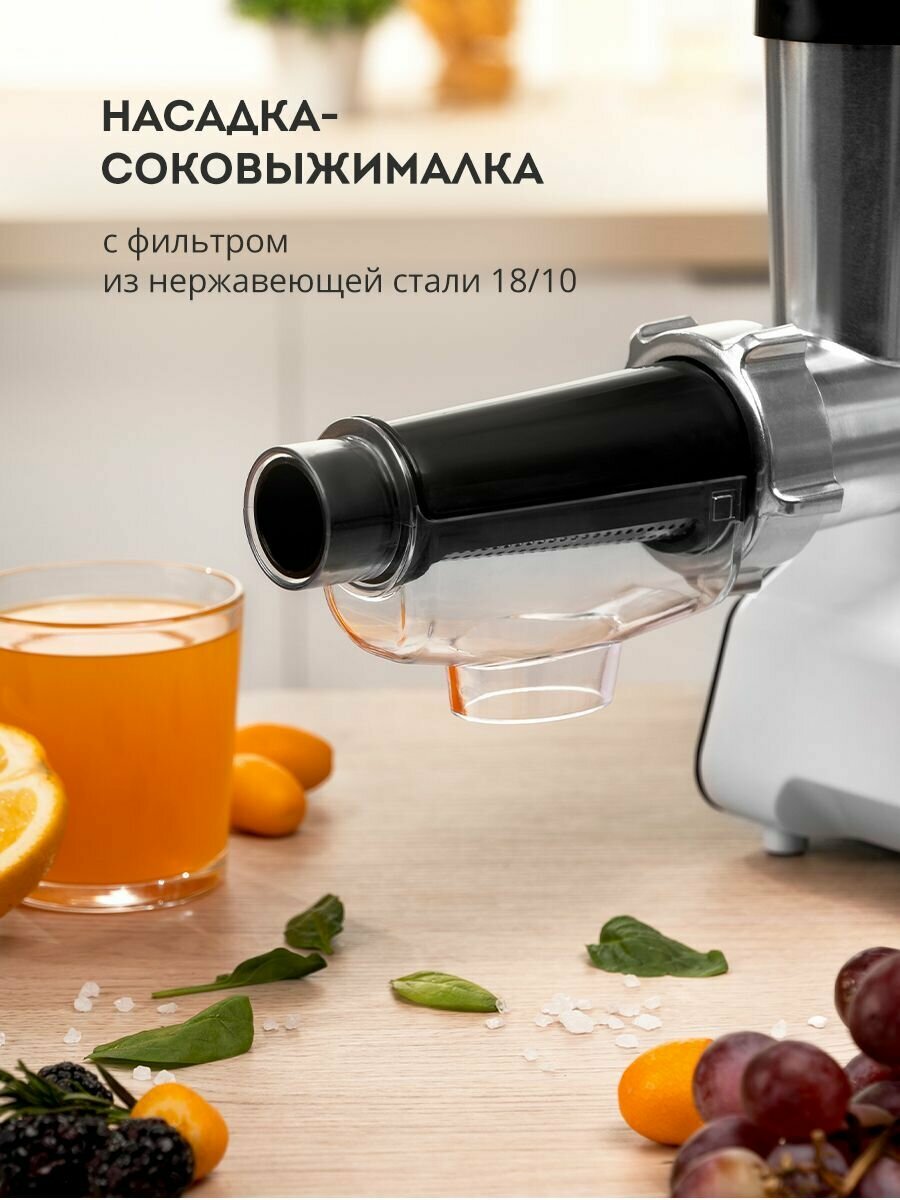 | Насадки | диск для фарша / насадка для кеббе / насадка для нарезки печенья / насадка для приготовления колбас / насадка-терка / соковыжималка |