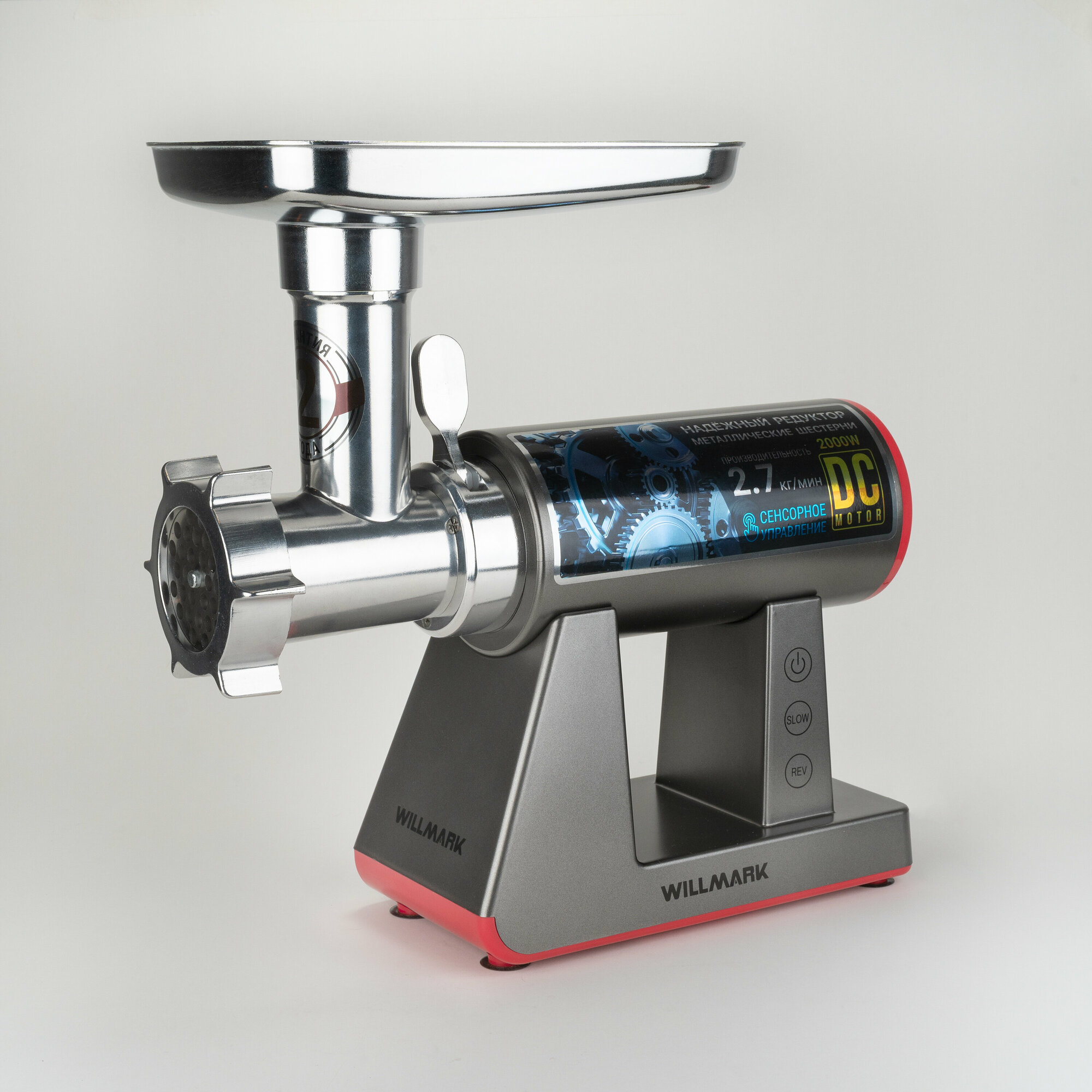 Мясорубка Willmark WMG-3683GS, серебристый, DC мотор, 2.7 кг/мин, реверс, сенсорное управление