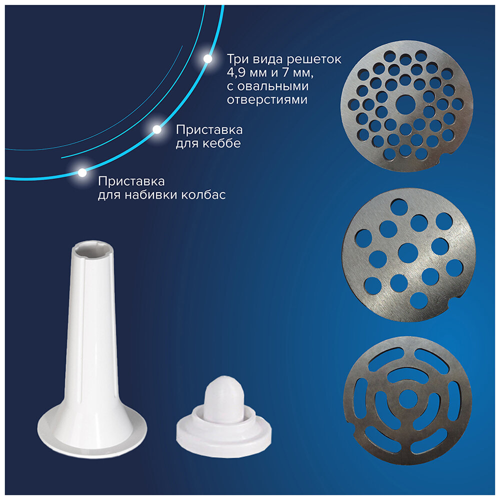 | Насадки | диск для фарша / насадка для кеббе / насадка для приготовления колбас / насадка для шинковки / насадка-терка / соковыжималка |