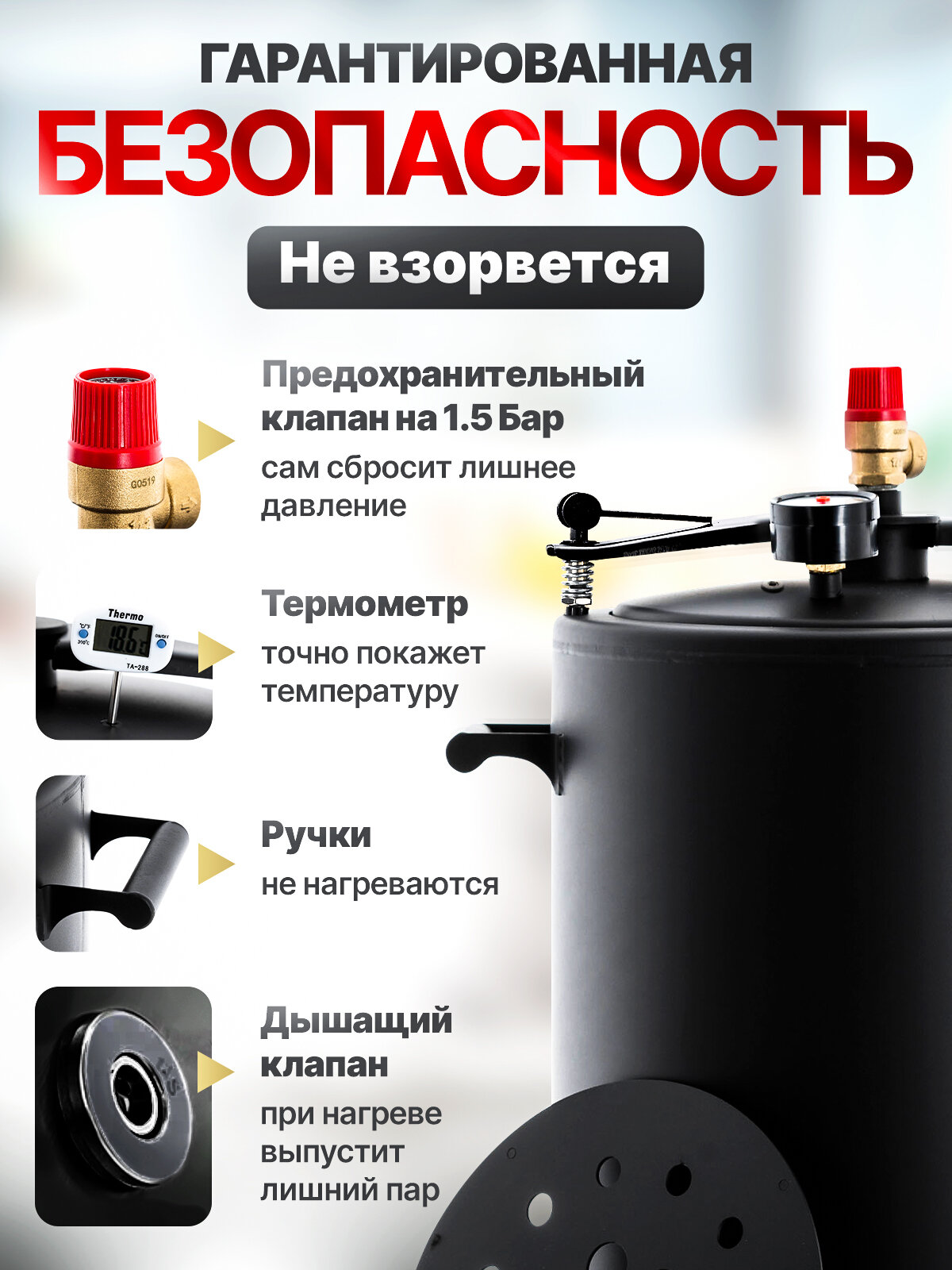 | Подробная комплектация | 1. Бак 1 шт 2. Крышка 1 шт 3. Манометр 1 шт 4. Термометр 1 шт 5. Предохранительный клапан 1 шт 6. Прижимная перекладина 1 шт 7. Фиксаторы - 2 шт 8. Фальш дно - 1 шт |