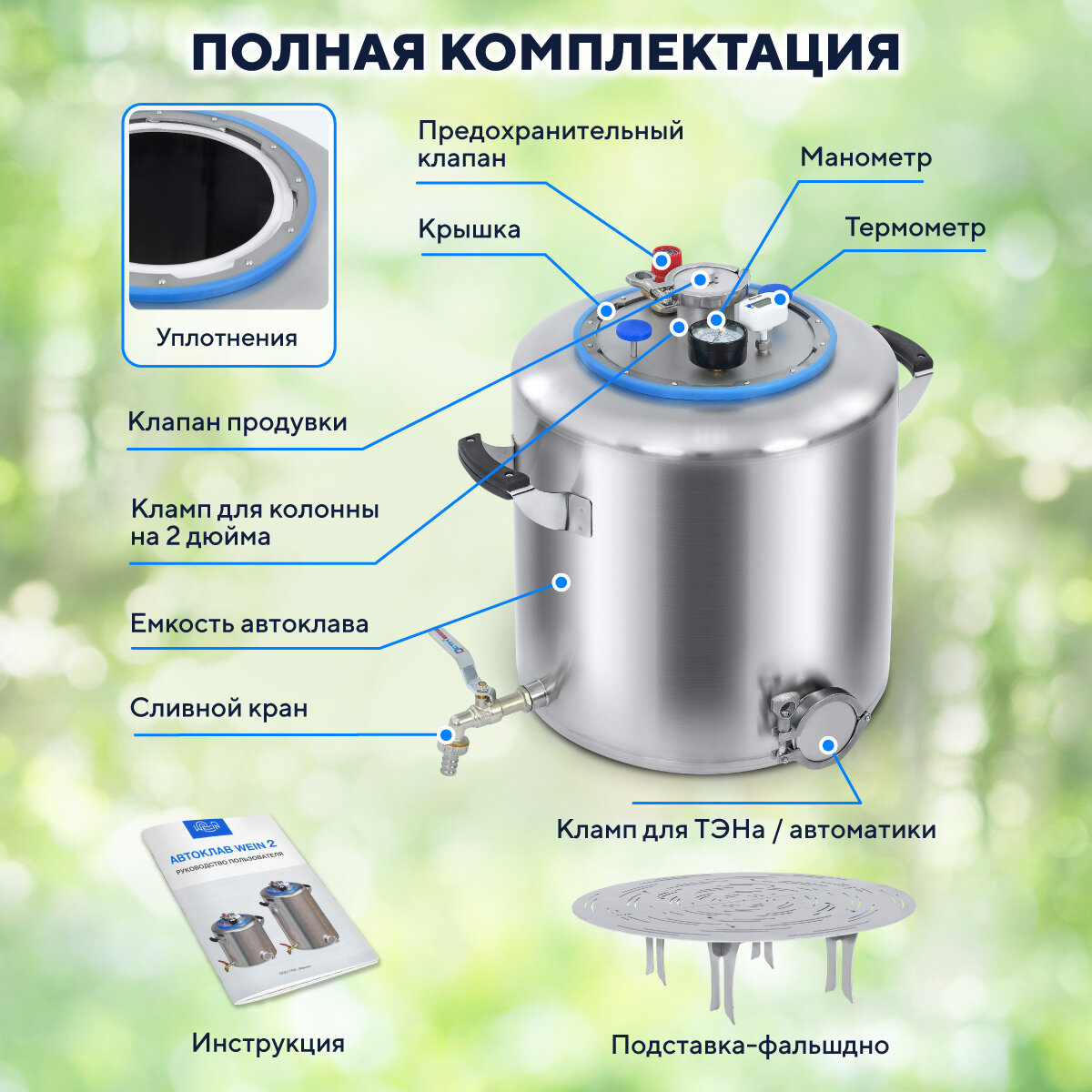 | Подробная комплектация | Емкость 1 шт; Крышка 1 шт; Фальшдно 2 шт; Клапан продувки 1 шт; Заглушка под кламп 2 дюйма 1 шт; Уплотнение байонета 1 шт; Резинка декоративная 1 шт; Колпачок ручки 2 шт; Силиконовая втулка 1 шт; Гайка М8 1 шт; Клапан предохранительный 1,5 бар 1 шт; Кран с носиком 1 шт; Манометр 1 шт; Термометр 1 шт; Хомут для клампа с уплотнением 2 дюйма 2 шт; Инструкция 1 шт. |