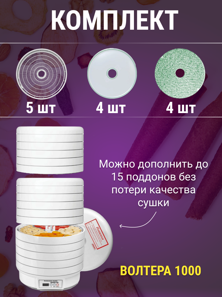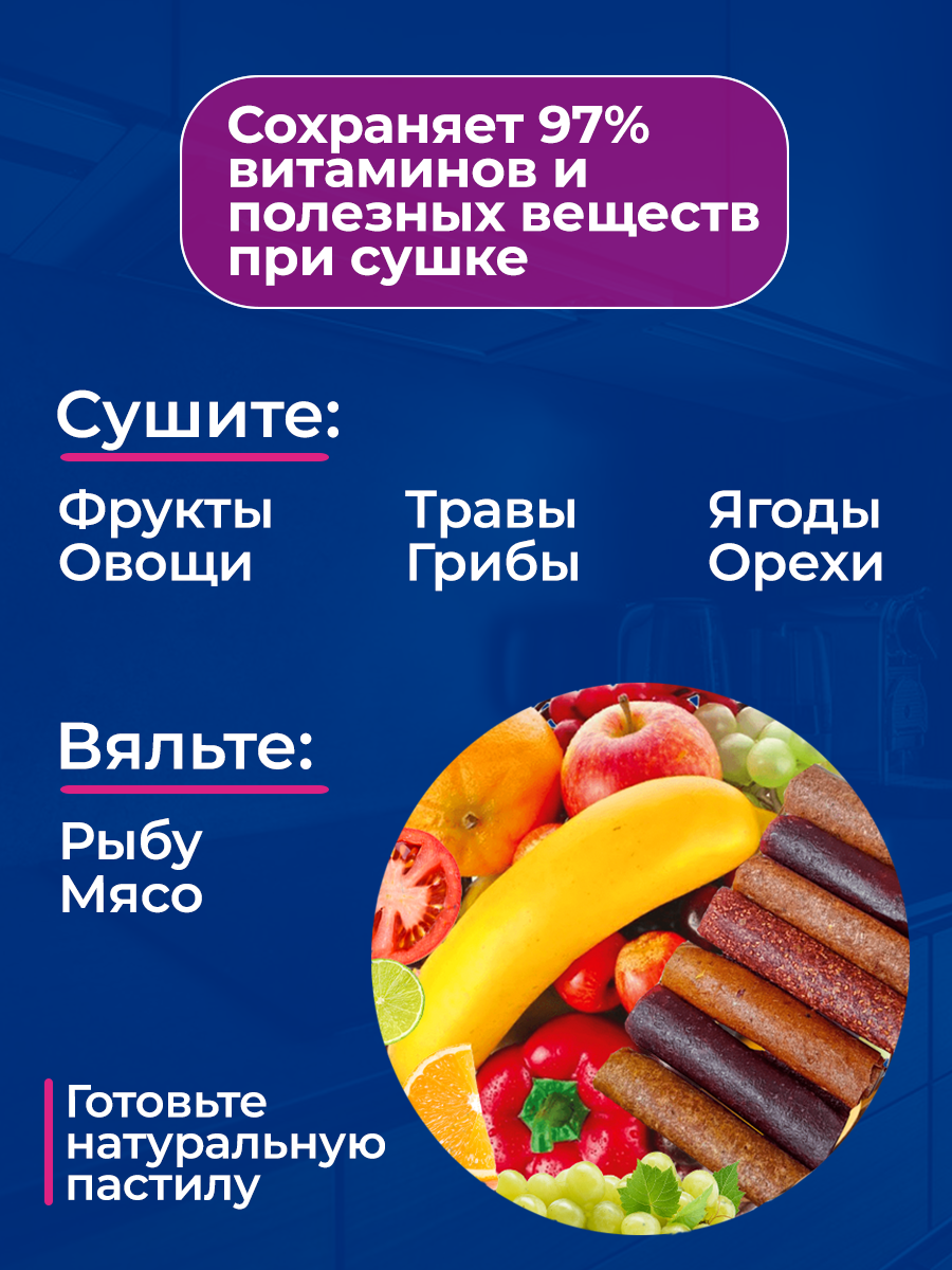 | Дополнительная информация | комплектация: 5 основных решет; 5 съемных сетчатых поддонов для мелких продуктов и лучшего снятия липких и вязких продуктов после сушки; 5 съемных поддонов для приготовления фруктовой пастилы |