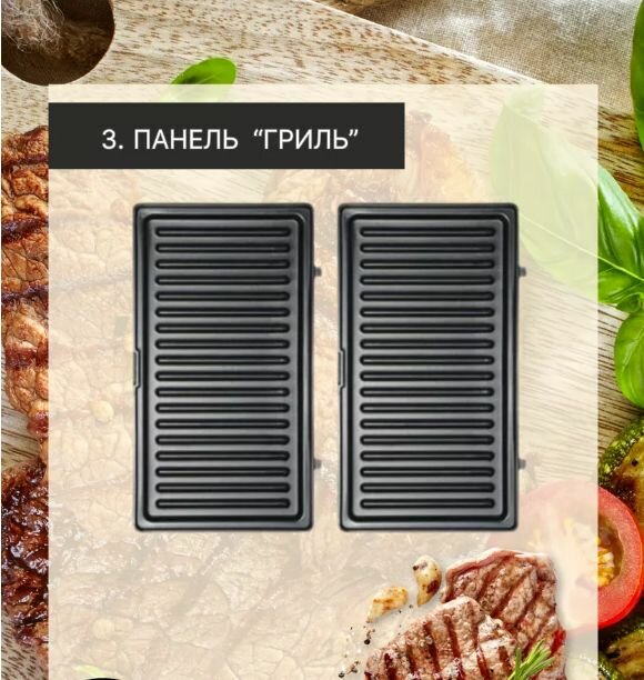 | Особенности | антипригарное покрытие, возможность смены панелей, защита от перегрева, индикатор работы, сигнал об окончании приготовления, электронное управление |