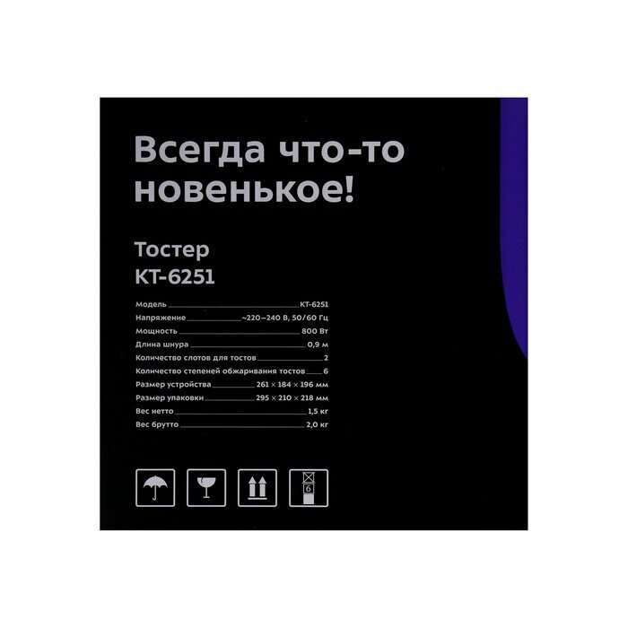 | Дополнительные функции | автоматическое поднятие тостов, автоматическое центрирование тостов, кнопка отмены, регулировка степени обжаривания |